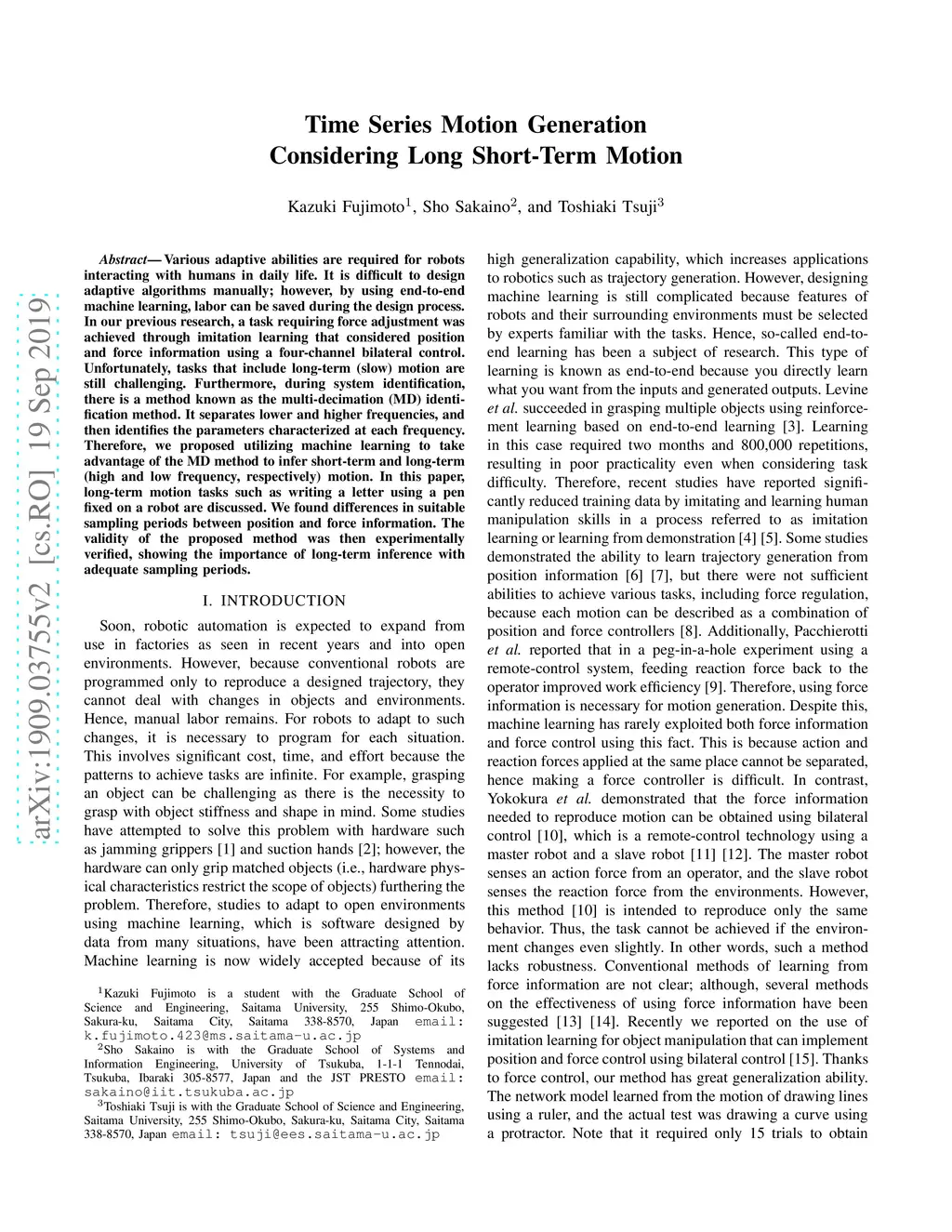Various adaptive abilities are required for robots interacting with humans in daily life. It is difficult to design adaptive algorithms manually; however, by using end-to-end machine learning, labor can be saved during the design process. In our previous research, a task requiring force adjustment was achieved through imitation learning that considered position and force information using a four-channel bilateral control. Unfortunately, tasks that include long-term (slow) motion are still challenging. Furthermore, during system identification, there is a method known as the multi-decimation (MD) identification method. It separates lower and higher frequencies, and then identifies the parameters characterized at each frequency. Therefore, we proposed utilizing machine learning to take advantage of the MD method to infer short-term and long-term (high and low frequency, respectively) motion. In this paper, long-term motion tasks such as writing a letter using a pen fixed on a robot are discussed. We found differences in suitable sampling periods between position and force information. The validity of the proposed method was then experimentally verified, showing the importance of long-term inference with adequate sampling periods.
