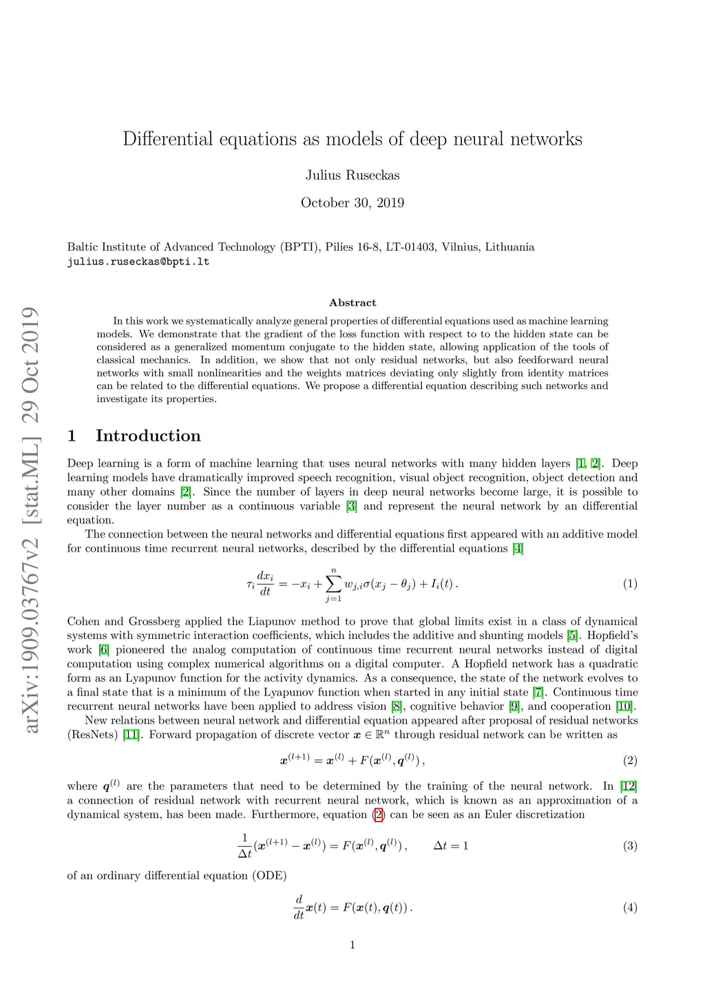 Differential equations as models of deep neural networks