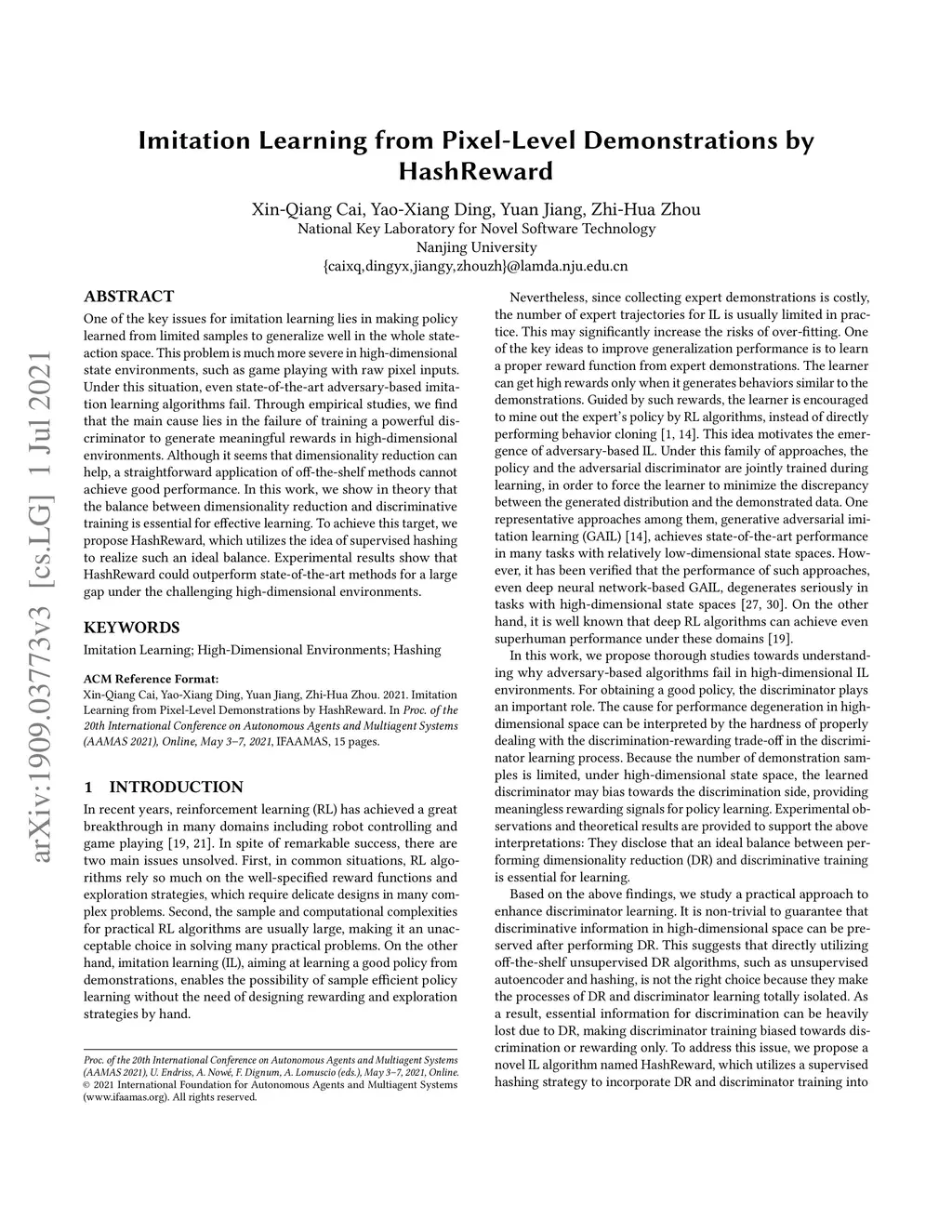 Imitation Learning from Pixel-Level Demonstrations by HashReward