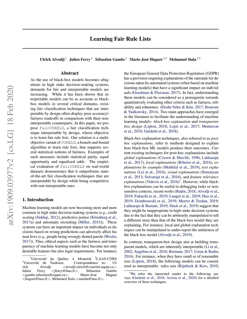 As the use of black-box models becomes ubiquitous in high stake decision-making systems, demands for fair and interpretable models are increasing. While it has been shown that interpretable models can be as accurate as black-box models in several critical domains, existing fair classification techniques that are interpretable by design often display poor accuracy/fairness tradeoffs in comparison with their non-interpretable counterparts. In this paper, we propose FairCORELS, a fair classification technique interpretable by design, whose objective is to learn fair rule lists. Our solution is a multi-objective variant of CORELS, a branch-and-bound algorithm to learn rule lists, that supports several statistical notions of fairness. Examples of such measures include statistical parity, equal opportunity and equalized odds. The empirical evaluation of FairCORELS on real-world datasets demonstrates that it outperforms state-of-the-art fair classification techniques that are interpretable by design while being competitive with non-interpretable ones.