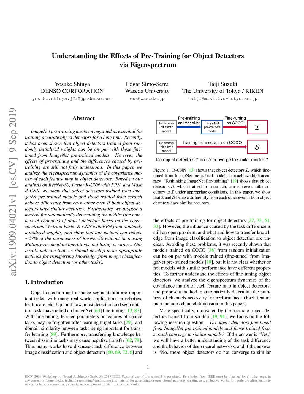 ImageNet pre-training has been regarded as essential for training accurate object detectors for a long time. Recently, it has been shown that object detectors trained from randomly initialized weights can be on par with those fine-tuned from ImageNet pre-trained models. However, the effects of pre-training and the differences caused by pre-training are still not fully understood. In this paper, we analyze the eigenspectrum dynamics of the covariance matrix of each feature map in object detectors. Based on our analysis on ResNet-50, Faster R-CNN with FPN, and Mask R-CNN, we show that object detectors trained from ImageNet pre-trained models and those trained from scratch behave differently from each other even if both object detectors have similar accuracy. Furthermore, we propose a method for automatically determining the widths (the numbers of channels) of object detectors based on the eigenspectrum. We train Faster R-CNN with FPN from randomly initialized weights, and show that our method can reduce ~27% of the parameters of ResNet-50 without increasing Multiply-Accumulate operations and losing accuracy. Our results indicate that we should develop more appropriate methods for transferring knowledge from image classification to object detection (or other tasks).