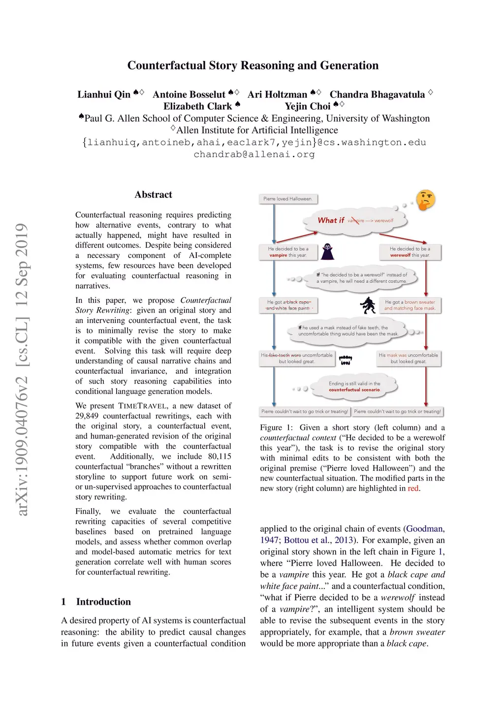 Counterfactual reasoning requires predicting how alternative events, contrary to what actually happened, might have resulted in different outcomes. Despite being considered a necessary component of AI-complete systems, few resources have been developed for evaluating counterfactual reasoning in narratives. In this paper, we propose Counterfactual Story Rewriting: given an original story and an intervening counterfactual event, the task is to minimally revise the story to make it compatible with the given counterfactual event. Solving this task will require deep understanding of causal narrative chains and counterfactual invariance, and integration of such story reasoning capabilities into conditional language generation models. We present TimeTravel, a new dataset of 29,849 counterfactual rewritings, each with the original story, a counterfactual event, and human-generated revision of the original story compatible with the counterfactual event. Additionally, we include 80,115 counterfactual "branches" without a rewritten storyline to support future work on semi- or un-supervised approaches to counterfactual story rewriting. Finally, we evaluate the counterfactual rewriting capacities of several competitive baselines based on pretrained language models, and assess whether common overlap and model-based automatic metrics for text generation correlate well with human scores for counterfactual rewriting.