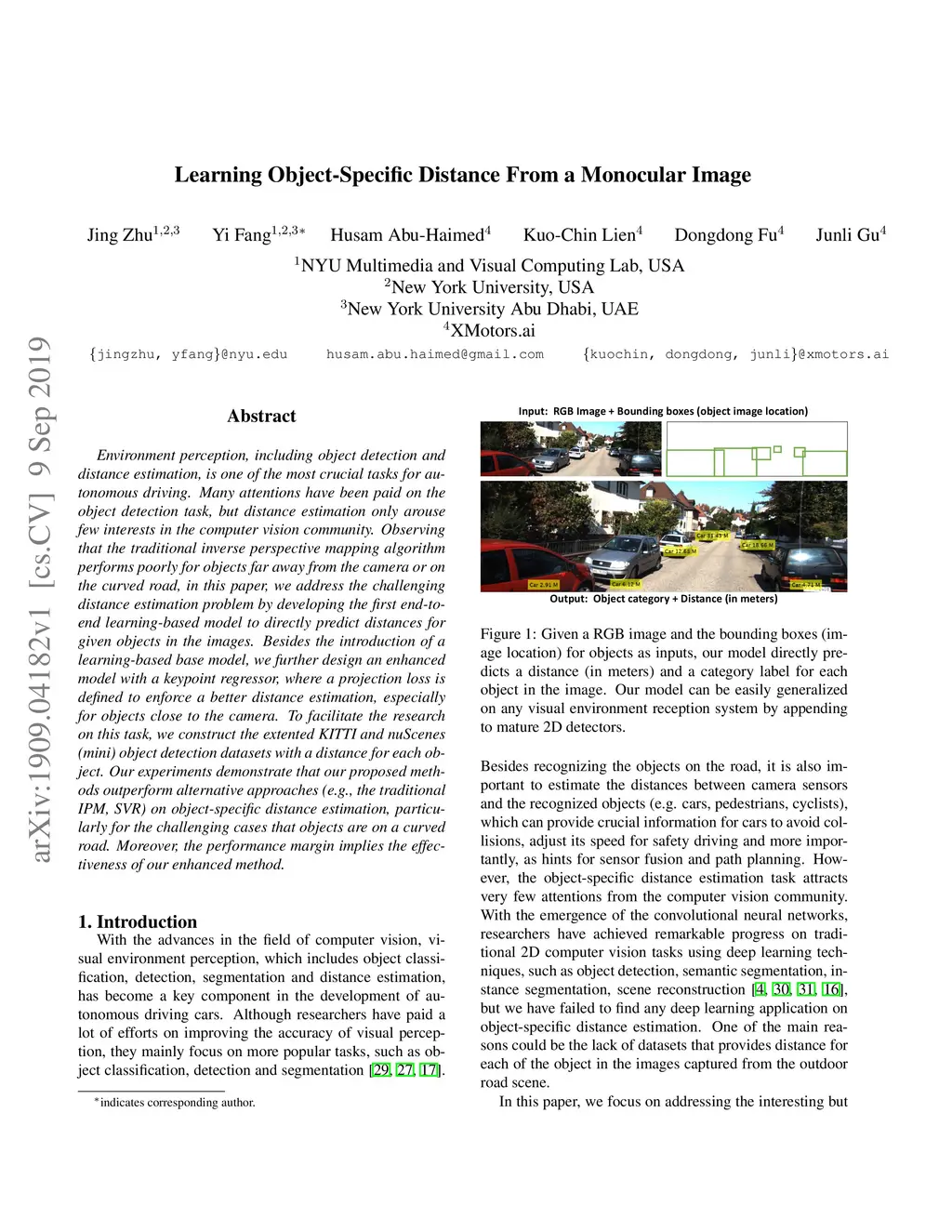 Environment perception, including object detection and distance estimation, is one of the most crucial tasks for autonomous driving. Many attentions have been paid on the object detection task, but distance estimation only arouse few interests in the computer vision community. Observing that the traditional inverse perspective mapping algorithm performs poorly for objects far away from the camera or on the curved road, in this paper, we address the challenging distance estimation problem by developing the first end-to-end learning-based model to directly predict distances for given objects in the images. Besides the introduction of a learning-based base model, we further design an enhanced model with a keypoint regressor, where a projection loss is defined to enforce a better distance estimation, especially for objects close to the camera. To facilitate the research on this task, we construct the extented KITTI and nuScenes (mini) object detection datasets with a distance for each object. Our experiments demonstrate that our proposed methods outperform alternative approaches (e.g., the traditional IPM, SVR) on object-specific distance estimation, particularly for the challenging cases that objects are on a curved road. Moreover, the performance margin implies the effectiveness of our enhanced method.