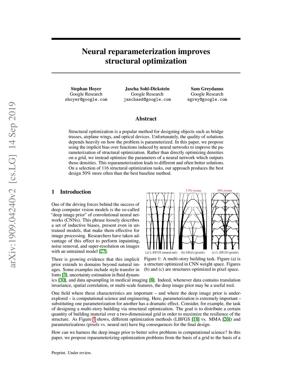 Neural reparameterization improves structural optimization