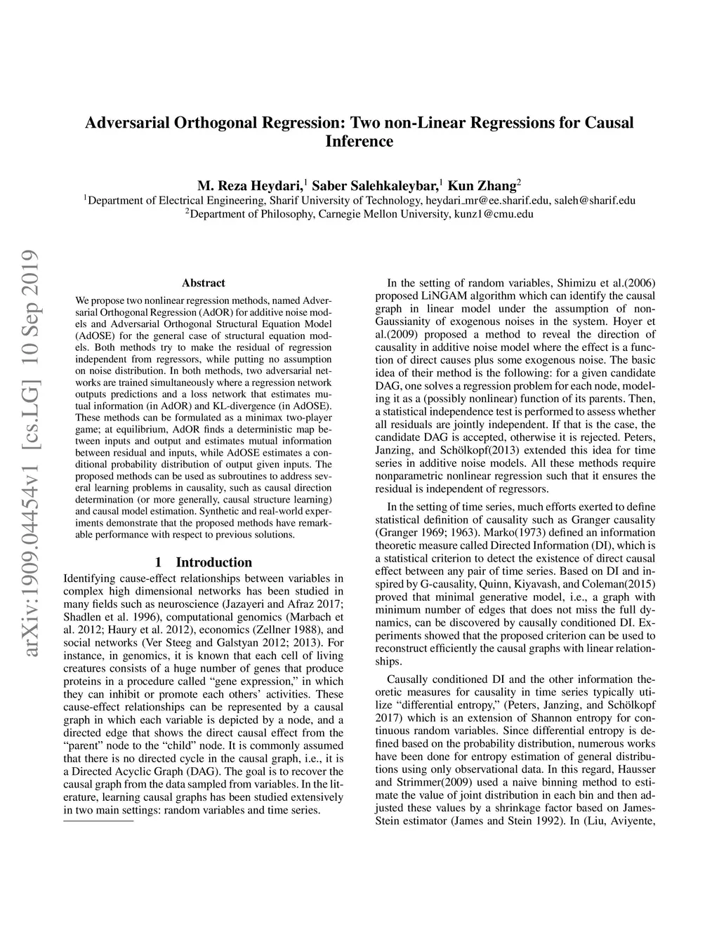 Adversarial Orthogonal Regression: Two non-Linear Regressions for Causal
