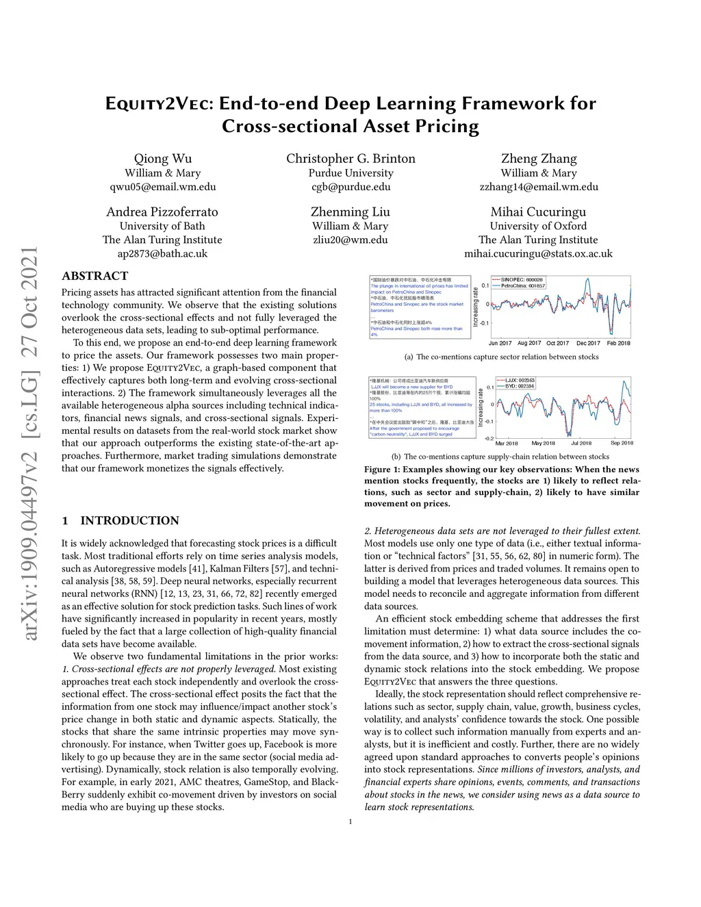 Pricing assets has attracted significant attention from the financial technology community. We observe that the existing solutions overlook the cross-sectional effects and not fully leveraged the heterogeneous data sets, leading to sub-optimal performance. To this end, we propose an end-to-end deep learning framework to price the assets. Our framework possesses two main properties: 1) We propose Equity2Vec, a graph-based component that effectively captures both long-term and evolving cross-sectional interactions. 2) The framework simultaneously leverages all the available heterogeneous alpha sources including technical indicators, financial news signals, and cross-sectional signals. Experimental results on datasets from the real-world stock market show that our approach outperforms the existing state-of-the-art approaches. Furthermore, market trading simulations demonstrate that our framework monetizes the signals effectively.