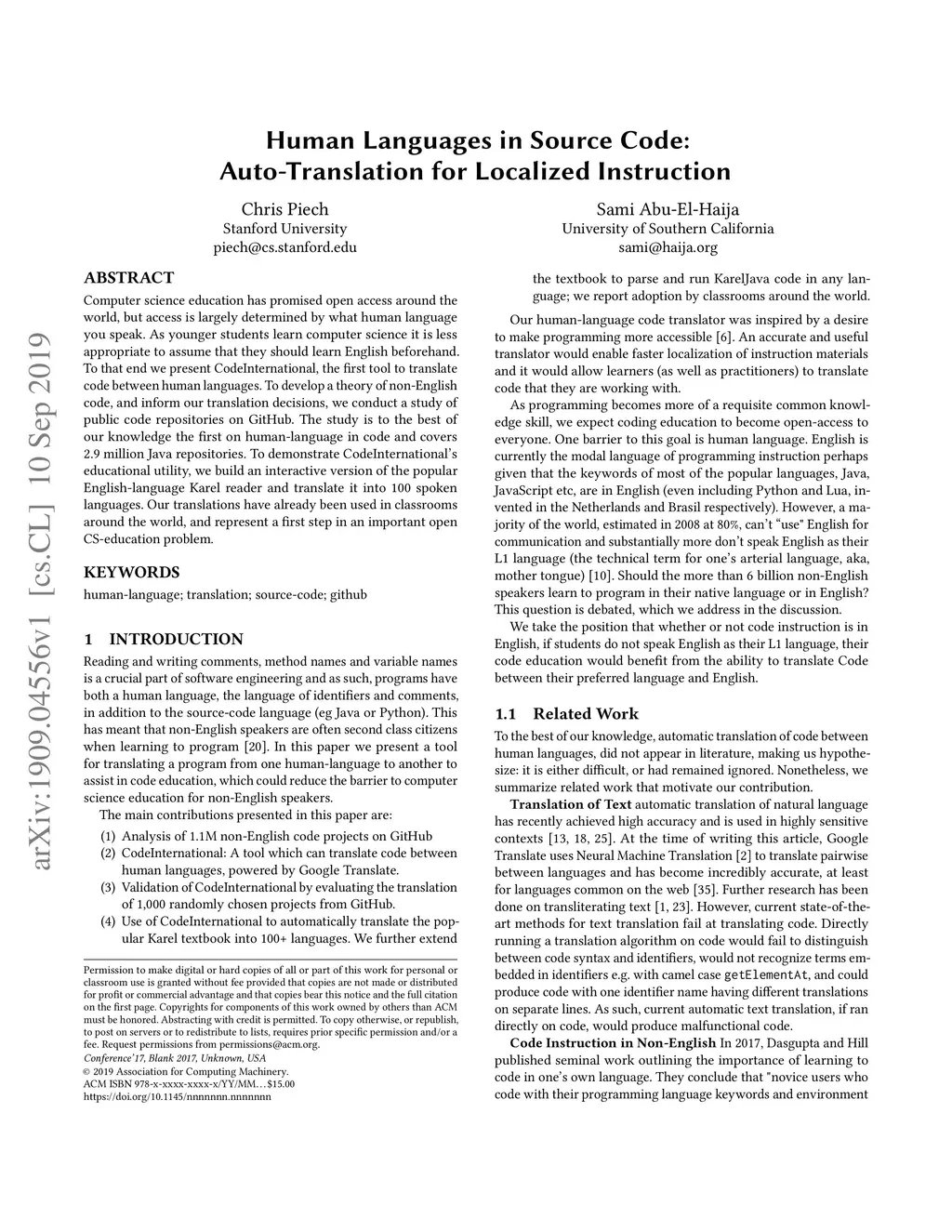 Computer science education has promised open access around the world, but access is largely determined by what human language you speak. As younger students learn computer science it is less appropriate to assume that they should learn English beforehand. To that end we present CodeInternational, the first tool to translate code between human languages. To develop a theory of non-English code, and inform our translation decisions, we conduct a study of public code repositories on GitHub. The study is to the best of our knowledge the first on human-language in code and covers 2.9 million Java repositories. To demonstrate CodeInternational's educational utility, we build an interactive version of the popular English-language Karel reader and translate it into 100 spoken languages. Our translations have already been used in classrooms around the world, and represent a first step in an important open CS-education problem.