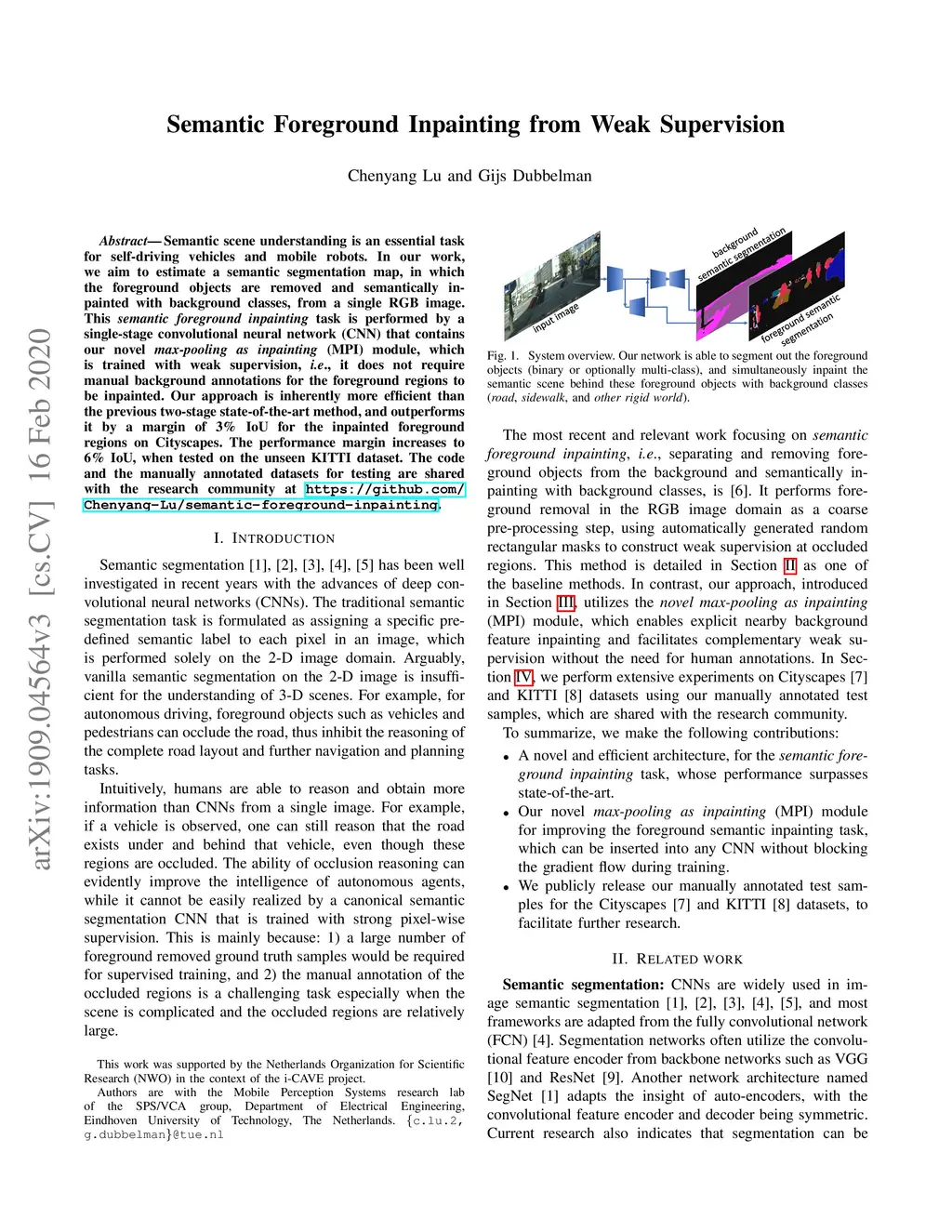 Semantic scene understanding is an essential task for self-driving vehicles and mobile robots. In our work, we aim to estimate a semantic segmentation map, in which the foreground objects are removed and semantically inpainted with background classes, from a single RGB image. This semantic foreground inpainting task is performed by a single-stage convolutional neural network (CNN) that contains our novel max-pooling as inpainting (MPI) module, which is trained with weak supervision, i.e., it does not require manual background annotations for the foreground regions to be inpainted. Our approach is inherently more efficient than the previous two-stage state-of-the-art method, and outperforms it by a margin of 3% IoU for the inpainted foreground regions on Cityscapes. The performance margin increases to 6% IoU, when tested on the unseen KITTI dataset. The code and the manually annotated datasets for testing are shared with the research community at https://github.com/Chenyang-Lu/semantic-foreground-inpainting.