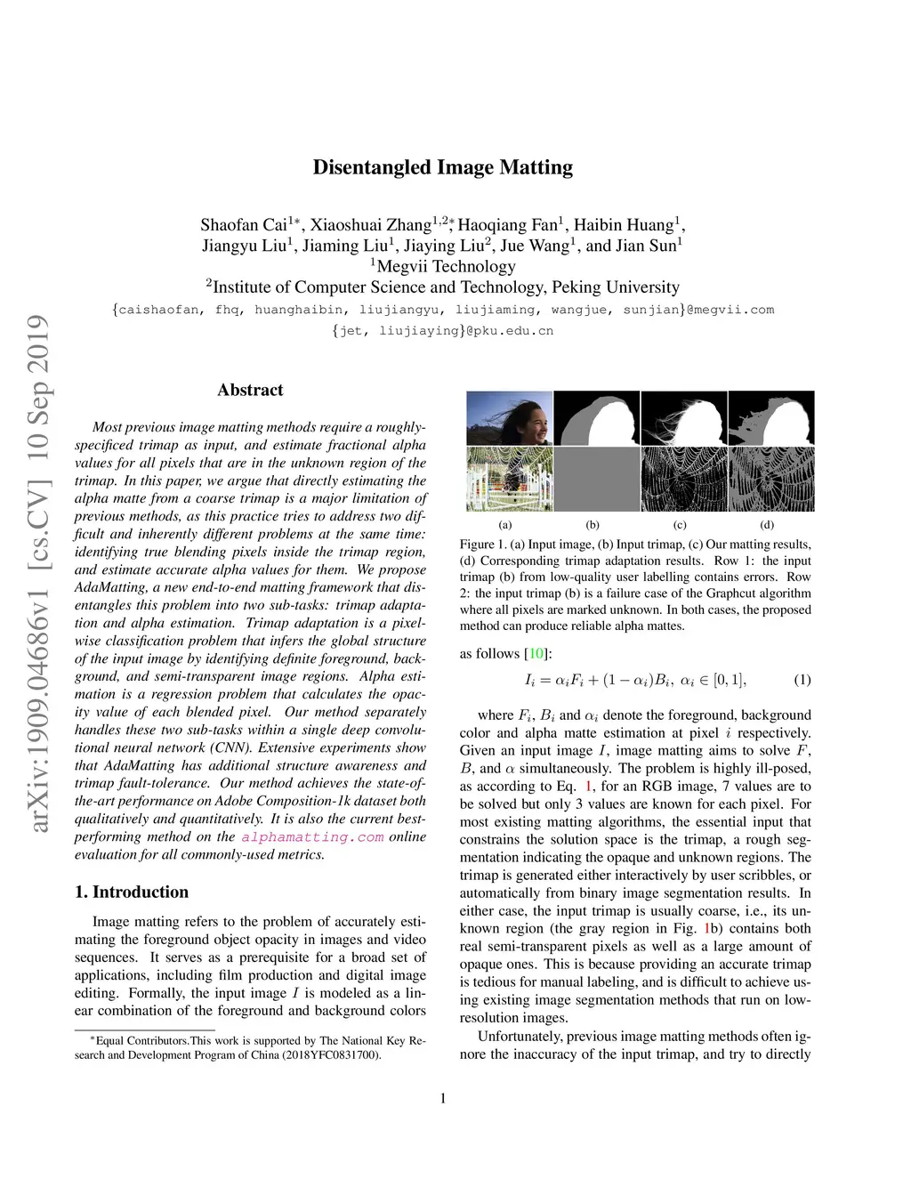 Most previous image matting methods require a roughly-specificed trimap as input, and estimate fractional alpha values for all pixels that are in the unknown region of the trimap. In this paper, we argue that directly estimating the alpha matte from a coarse trimap is a major limitation of previous methods, as this practice tries to address two difficult and inherently different problems at the same time: identifying true blending pixels inside the trimap region, and estimate accurate alpha values for them. We propose AdaMatting, a new end-to-end matting framework that disentangles this problem into two sub-tasks: trimap adaptation and alpha estimation. Trimap adaptation is a pixel-wise classification problem that infers the global structure of the input image by identifying definite foreground, background, and semi-transparent image regions. Alpha estimation is a regression problem that calculates the opacity value of each blended pixel. Our method separately handles these two sub-tasks within a single deep convolutional neural network (CNN). Extensive experiments show that AdaMatting has additional structure awareness and trimap fault-tolerance. Our method achieves the state-of-the-art performance on Adobe Composition-1k dataset both qualitatively and quantitatively. It is also the current best-performing method on the alphamatting.com online evaluation for all commonly-used metrics.