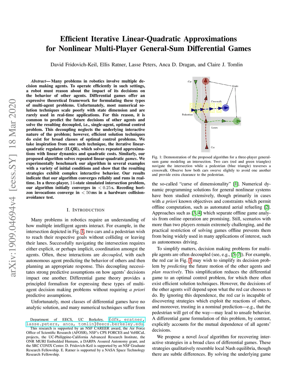 Many problems in robotics involve multiple decision making agents. To operate efficiently in such settings, a robot must reason about the impact of its decisions on the behavior of other agents. Differential games offer an expressive theoretical framework for formulating these types of multi-agent problems. Unfortunately, most numerical solution techniques scale poorly with state dimension and are rarely used in real-time applications. For this reason, it is common to predict the future decisions of other agents and solve the resulting decoupled, i.e., single-agent, optimal control problem. This decoupling neglects the underlying interactive nature of the problem; however, efficient solution techniques do exist for broad classes of optimal control problems. We take inspiration from one such technique, the iterative linear-quadratic regulator (ILQR), which solves repeated approximations with linear dynamics and quadratic costs. Similarly, our proposed algorithm solves repeated linear-quadratic games. We experimentally benchmark our algorithm in several examples with a variety of initial conditions and show that the resulting strategies exhibit complex interactive behavior. Our results indicate that our algorithm converges reliably and runs in real-time. In a three-player, 14-state simulated intersection problem, our algorithm initially converges in < 0.25s. Receding horizon invocations converge in < 50 ms in a hardware collision-avoidance test.