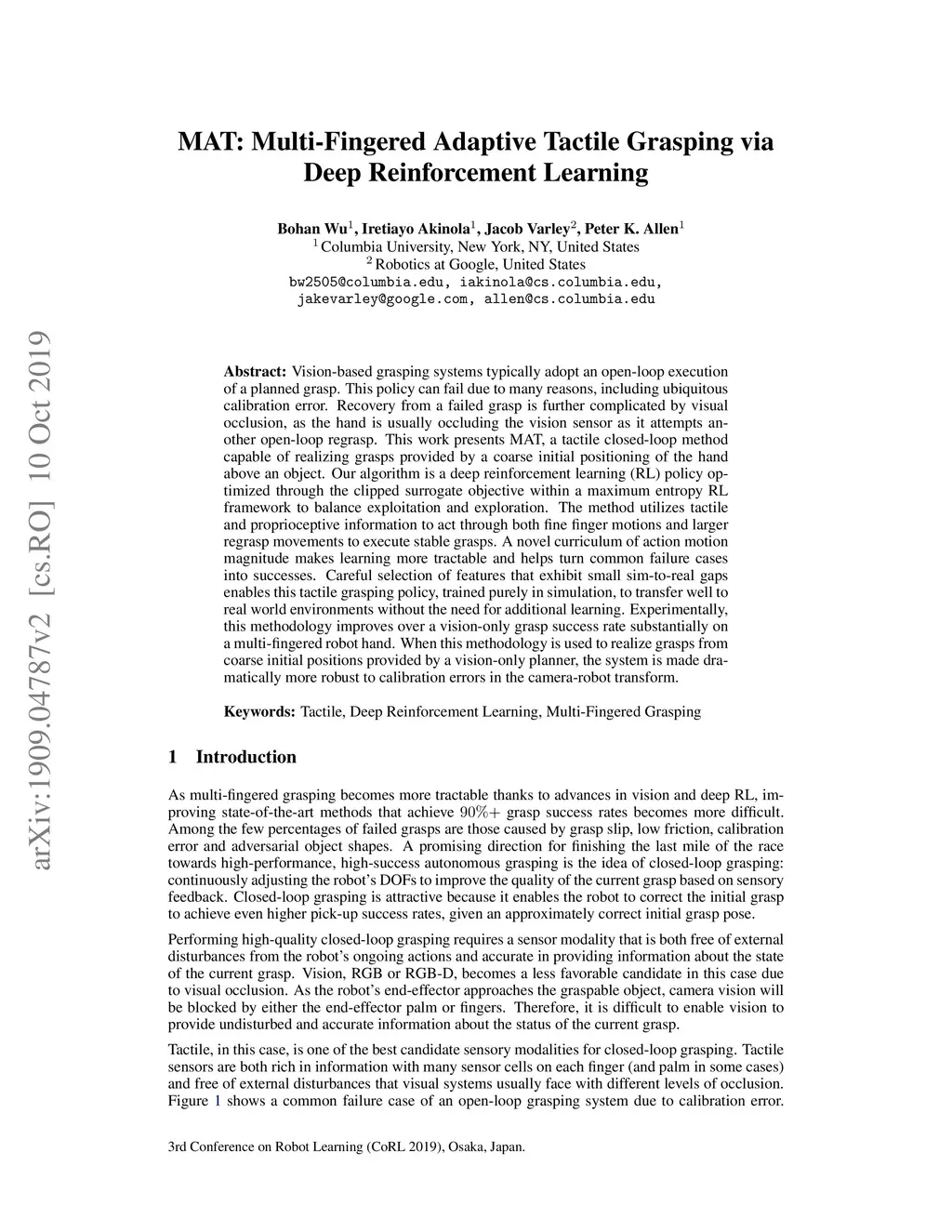 Vision-based grasping systems typically adopt an open-loop execution of a planned grasp. This policy can fail due to many reasons, including ubiquitous calibration error. Recovery from a failed grasp is further complicated by visual occlusion, as the hand is usually occluding the vision sensor as it attempts another open-loop regrasp. This work presents MAT, a tactile closed-loop method capable of realizing grasps provided by a coarse initial positioning of the hand above an object. Our algorithm is a deep reinforcement learning (RL) policy optimized through the clipped surrogate objective within a maximum entropy RL framework to balance exploitation and exploration. The method utilizes tactile and proprioceptive information to act through both fine finger motions and larger regrasp movements to execute stable grasps. A novel curriculum of action motion magnitude makes learning more tractable and helps turn common failure cases into successes. Careful selection of features that exhibit small sim-to-real gaps enables this tactile grasping policy, trained purely in simulation, to transfer well to real world environments without the need for additional learning. Experimentally, this methodology improves over a vision-only grasp success rate substantially on a multi-fingered robot hand. When this methodology is used to realize grasps from coarse initial positions provided by a vision-only planner, the system is made dramatically more robust to calibration errors in the camera-robot transform.