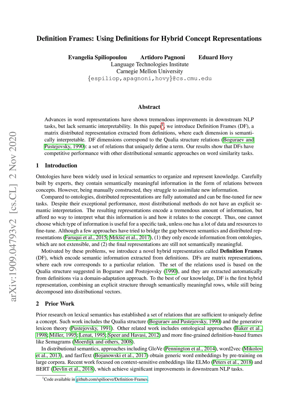 Advances in word representations have shown tremendous improvements in downstream NLP tasks, but lack semantic interpretability. In this paper, we introduce Definition Frames (DF), a matrix distributed representation extracted from definitions, where each dimension is semantically interpretable. DF dimensions correspond to the Qualia structure relations: a set of relations that uniquely define a term. Our results show that DFs have competitive performance with other distributional semantic approaches on word similarity tasks.