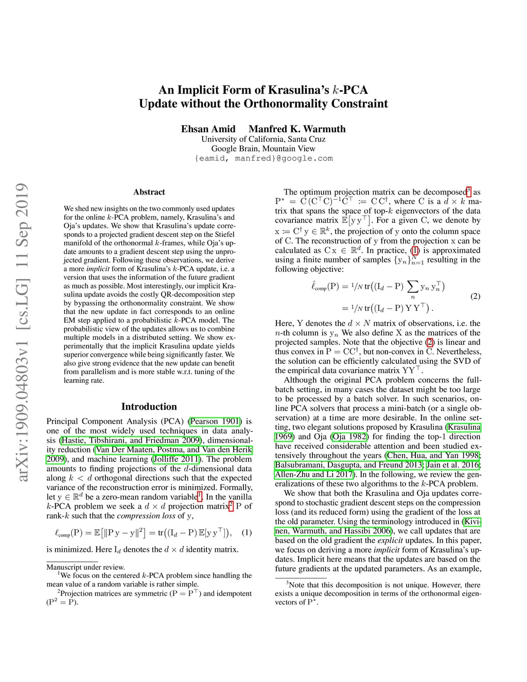 We shed new insights on the two commonly used updates for the online -PCA problem, namely, Krasulina's and Oja's updates. We show that Krasulina's update corresponds to a projected gradient descent step on the Stiefel manifold of the orthonormal -frames, while Oja's update amounts to a gradient descent step using the unprojected gradient. Following these observations, we derive a more \emph{implicit} form of Krasulina's -PCA update, i.e. a version that uses the information of the future gradient as much as possible. Most interestingly, our implicit Krasulina update avoids the costly QR-decomposition step by bypassing the orthonormality constraint. We show that the new update in fact corresponds to an online EM step applied to a probabilistic -PCA model. The probabilistic view of the updates allows us to combine multiple models in a distributed setting. We show experimentally that the implicit Krasulina update yields superior convergence while being significantly faster. We also give strong evidence that the new update can benefit from parallelism and is more stable w.r.t. tuning of the learning rate.