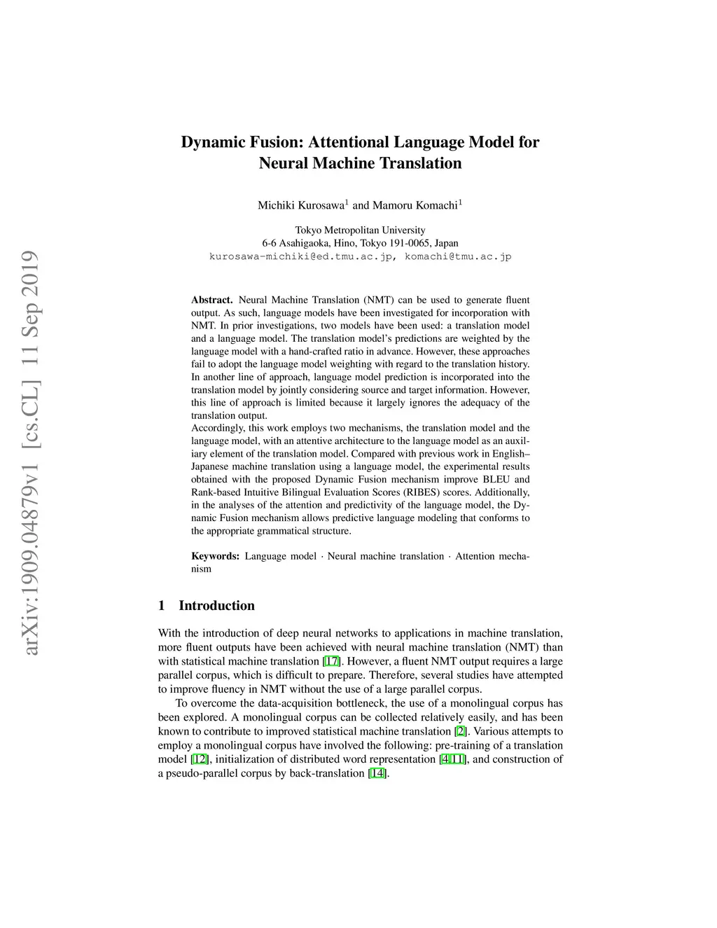 Neural Machine Translation (NMT) can be used to generate fluent output. As such, language models have been investigated for incorporation with NMT. In prior investigations, two models have been used: a translation model and a language model. The translation model's predictions are weighted by the language model with a hand-crafted ratio in advance. However, these approaches fail to adopt the language model weighting with regard to the translation history. In another line of approach, language model prediction is incorporated into the translation model by jointly considering source and target information. However, this line of approach is limited because it largely ignores the adequacy of the translation output. Accordingly, this work employs two mechanisms, the translation model and the language model, with an attentive architecture to the language model as an auxiliary element of the translation model. Compared with previous work in English--Japanese machine translation using a language model, the experimental results obtained with the proposed Dynamic Fusion mechanism improve BLEU and Rank-based Intuitive Bilingual Evaluation Scores (RIBES) scores. Additionally, in the analyses of the attention and predictivity of the language model, the Dynamic Fusion mechanism allows predictive language modeling that conforms to the appropriate grammatical structure.