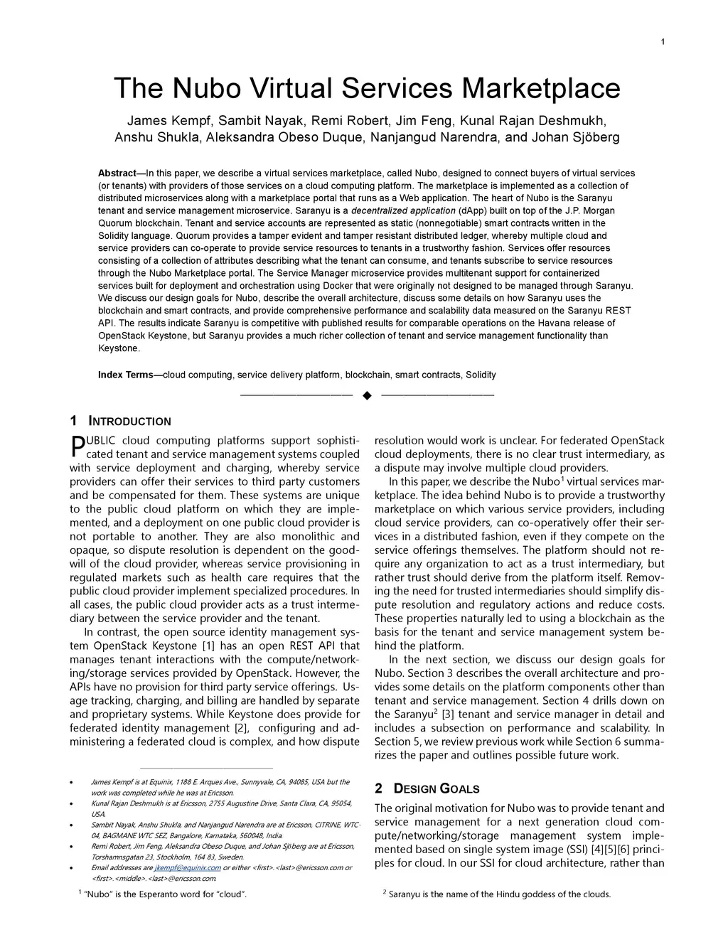 In this paper, we describe a virtual services marketplace, called Nubo, designed to connect buyers of virtual services (or tenants) with providers of those services on a cloud computing platform. The marketplace is implemented as a collection of distributed microservices along with a marketplace portal that runs as a Web application. The heart of Nubo is the Saranyu tenant and service management microservice. Saranyu is a decentralized application (dApp) built on top of the J.P. Morgan Quorum blockchain. Tenant and service accounts are represented as static (nonnegotiable) smart contracts written in the Solidity language. Quorum provides a tamper evident and tamper resistant distributed ledger, whereby multiple cloud and service providers can co-operate to provide service resources to tenants in a trustworthy fashion. Services offer resources consisting of a collection of attributes describing what the tenant can consume, and tenants subscribe to service resources through the Nubo Marketplace portal. The Service Manager microservice provides multitenant support for containerized services built for deployment and orchestration using Docker that were originally not designed to be managed through Saranyu. We discuss our design goals for Nubo, describe the overall architecture, discuss some details on how Saranyu uses the blockchain and smart contracts, and provide comprehensive performance and scalability data measured on the Saranyu REST API. The results indicate Saranyu is competitive with published results for comparable operations on the Havana release of OpenStack Keystone, but Saranyu provides a much richer collection of tenant and service management functionality than Keystone.