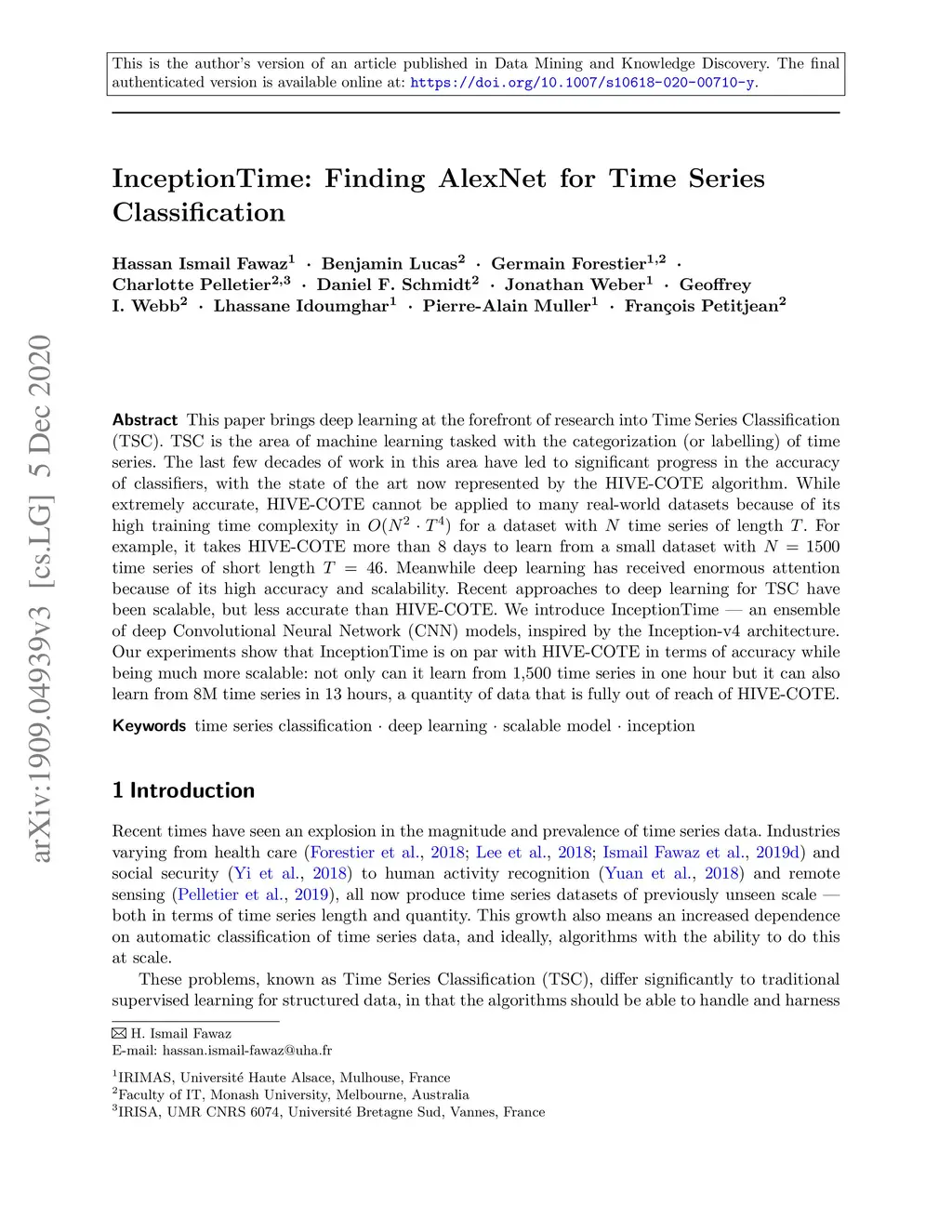 This paper brings deep learning at the forefront of research into Time Series Classification (TSC). TSC is the area of machine learning tasked with the categorization (or labelling) of time series. The last few decades of work in this area have led to significant progress in the accuracy of classifiers, with the state of the art now represented by the HIVE-COTE algorithm. While extremely accurate, HIVE-COTE cannot be applied to many real-world datasets because of its high training time complexity in O(N2 * T4) for a dataset with N time series of length T. For example, it takes HIVE-COTE more than 8 days to learn from a small dataset with N = 1500 time series of short length T = 46. Meanwhile deep learning has received enormous attention because of its high accuracy and scalability. Recent approaches to deep learning for TSC have been scalable, but less accurate than HIVE-COTE. We introduce InceptionTime - an ensemble of deep Convolutional Neural Network (CNN) models, inspired by the Inception-v4 architecture. Our experiments show that InceptionTime is on par with HIVE-COTE in terms of accuracy while being much more scalable: not only can it learn from 1,500 time series in one hour but it can also learn from 8M time series in 13 hours, a quantity of data that is fully out of reach of HIVE-COTE.