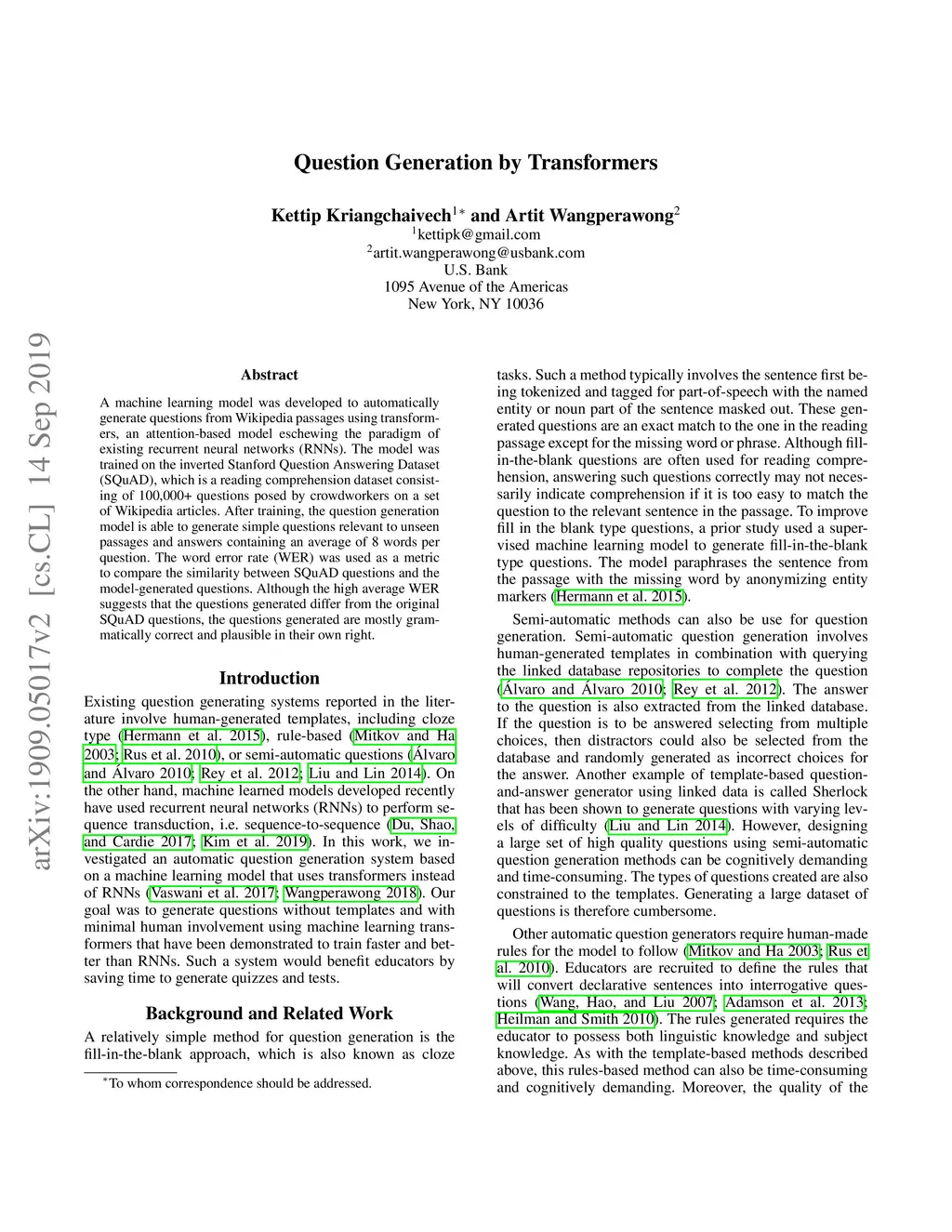 A machine learning model was developed to automatically generate questions from Wikipedia passages using transformers, an attention-based model eschewing the paradigm of existing recurrent neural networks (RNNs). The model was trained on the inverted Stanford Question Answering Dataset (SQuAD), which is a reading comprehension dataset consisting of 100,000+ questions posed by crowdworkers on a set of Wikipedia articles. After training, the question generation model is able to generate simple questions relevant to unseen passages and answers containing an average of 8 words per question. The word error rate (WER) was used as a metric to compare the similarity between SQuAD questions and the model-generated questions. Although the high average WER suggests that the questions generated differ from the original SQuAD questions, the questions generated are mostly grammatically correct and plausible in their own right.
