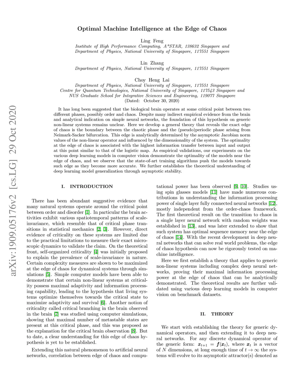 It has long been suggested that the biological brain operates at some critical point between two different phases, possibly order and chaos. Despite many indirect empirical evidence from the brain and analytical indication on simple neural networks, the foundation of this hypothesis on generic non-linear systems remains unclear. Here we develop a general theory that reveals the exact edge of chaos is the boundary between the chaotic phase and the (pseudo)periodic phase arising from Neimark-Sacker bifurcation. This edge is analytically determined by the asymptotic Jacobian norm values of the non-linear operator and influenced by the dimensionality of the system. The optimality at the edge of chaos is associated with the highest information transfer between input and output at this point similar to that of the logistic map. As empirical validations, our experiments on the various deep learning models in computer vision demonstrate the optimality of the models near the edge of chaos, and we observe that the state-of-art training algorithms push the models towards such edge as they become more accurate. We further establishes the theoretical understanding of deep learning model generalization through asymptotic stability.