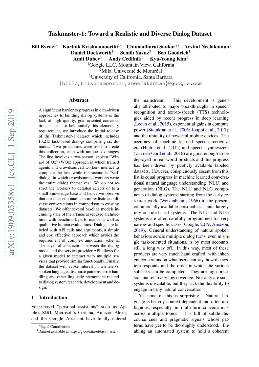 A significant barrier to progress in data-driven approaches to building dialog systems is the lack of high quality, goal-oriented conversational data. To help satisfy this elementary requirement, we introduce the initial release of the Taskmaster-1 dataset which includes 13,215 task-based dialogs comprising six domains. Two procedures were used to create this collection, each with unique advantages. The first involves a two-person, spoken "Wizard of Oz" (WOz) approach in which trained agents and crowdsourced workers interact to complete the task while the second is "self-dialog" in which crowdsourced workers write the entire dialog themselves. We do not restrict the workers to detailed scripts or to a small knowledge base and hence we observe that our dataset contains more realistic and diverse conversations in comparison to existing datasets. We offer several baseline models including state of the art neural seq2seq architectures with benchmark performance as well as qualitative human evaluations. Dialogs are labeled with API calls and arguments, a simple and cost effective approach which avoids the requirement of complex annotation schema. The layer of abstraction between the dialog model and the service provider API allows for a given model to interact with multiple services that provide similar functionally. Finally, the dataset will evoke interest in written vs. spoken language, discourse patterns, error handling and other linguistic phenomena related to dialog system research, development and design.