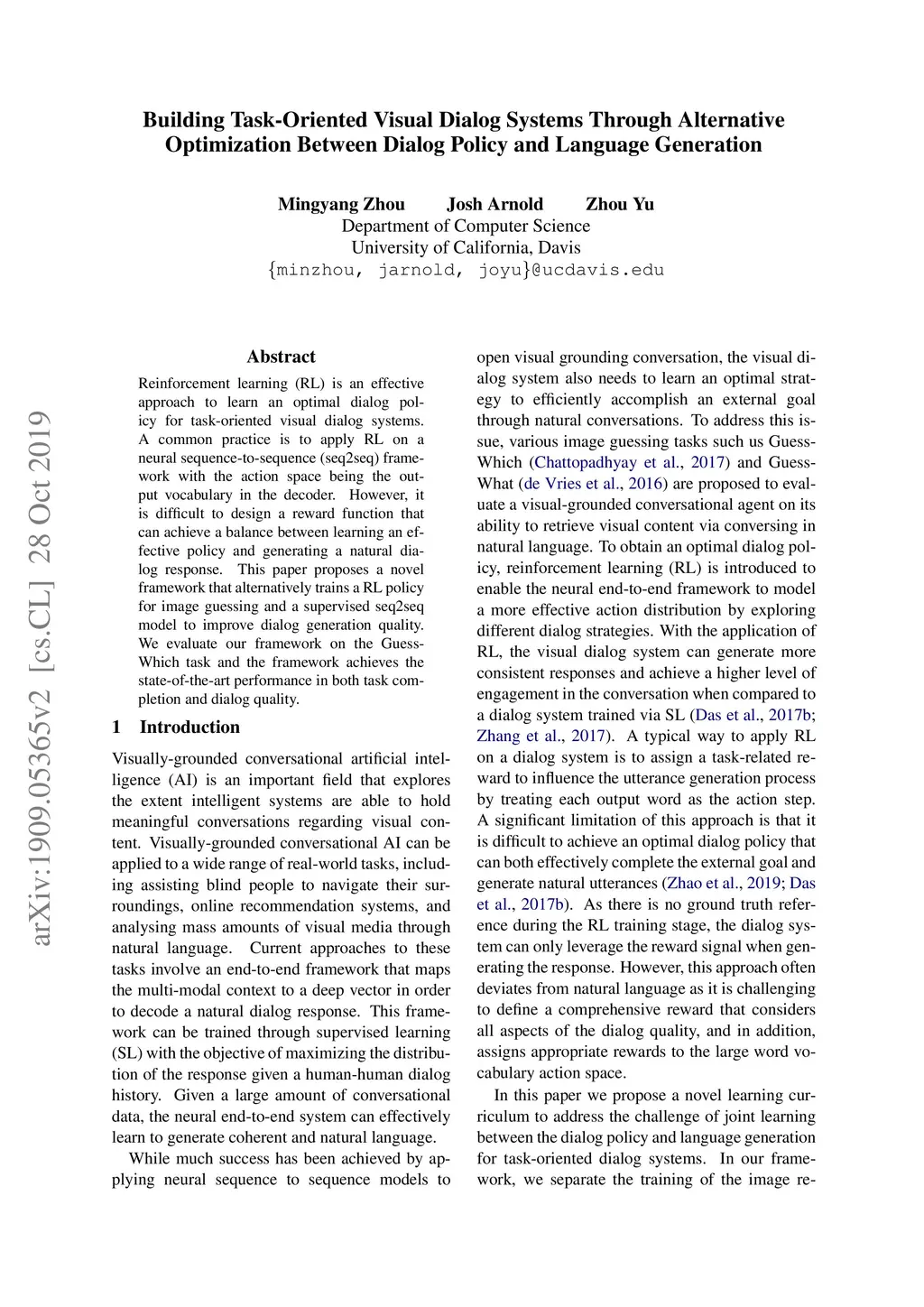 Reinforcement learning (RL) is an effective approach to learn an optimal dialog policy for task-oriented visual dialog systems. A common practice is to apply RL on a neural sequence-to-sequence (seq2seq) framework with the action space being the output vocabulary in the decoder. However, it is difficult to design a reward function that can achieve a balance between learning an effective policy and generating a natural dialog response. This paper proposes a novel framework that alternatively trains a RL policy for image guessing and a supervised seq2seq model to improve dialog generation quality. We evaluate our framework on the GuessWhich task and the framework achieves the state-of-the-art performance in both task completion and dialog quality.