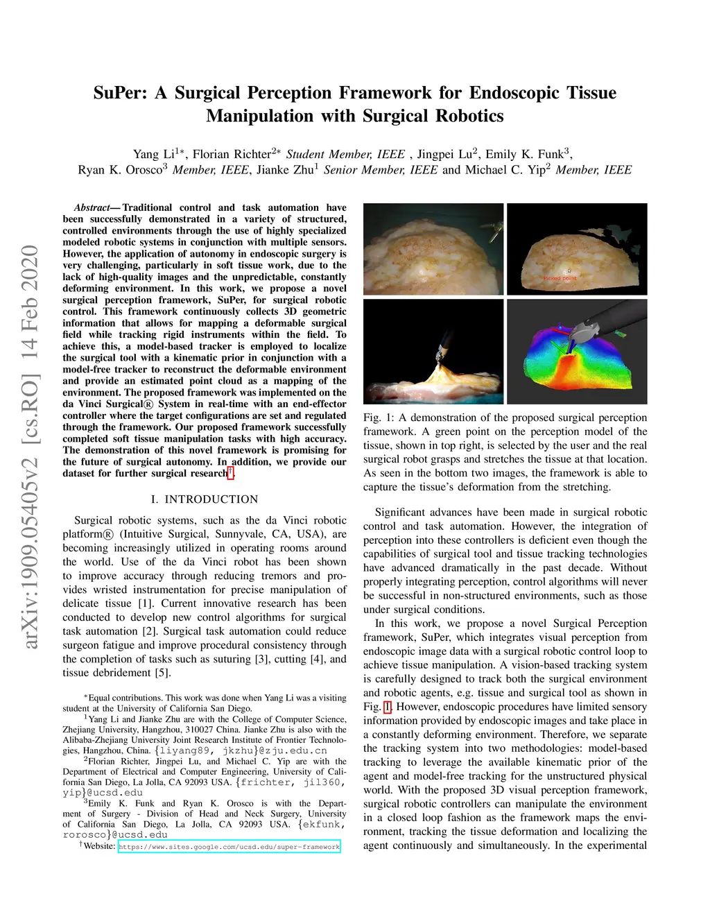 Traditional control and task automation have been successfully demonstrated in a variety of structured, controlled environments through the use of highly specialized modeled robotic systems in conjunction with multiple sensors. However, application of autonomy in endoscopic surgery is very challenging, particularly in soft tissue work, due to the lack of high-quality images and the unpredictable, constantly deforming environment. In this work, we propose a novel surgical perception framework, SuPer, for surgical robotic control. This framework continuously collects 3D geometric information that allows for mapping of a deformable surgical field while tracking rigid instruments within the field. To achieve this, a model-based tracker is employed to localize the surgical tool with a kinematic prior in conjunction with a model-free tracker to reconstruct the deformable environment and provide an estimated point cloud as a mapping of the environment. The proposed framework was implemented on the da Vinci Surgical System in real-time with an end-effector controller where the target configurations are set and regulated through the framework. Our proposed framework successfully completed autonomous soft tissue manipulation tasks with high accuracy. The demonstration of this novel framework is promising for the future of surgical autonomy. In addition, we provide our dataset for further surgical research.
