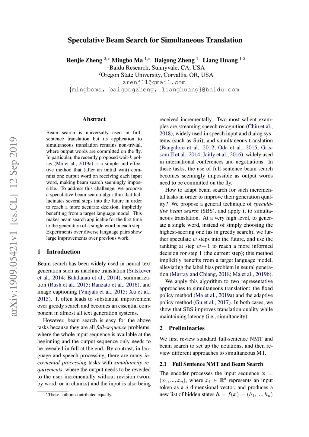 Beam search is universally used in full-sentence translation but its application to simultaneous translation remains non-trivial, where output words are committed on the fly. In particular, the recently proposed wait-k policy (Ma et al., 2019a) is a simple and effective method that (after an initial wait) commits one output word on receiving each input word, making beam search seemingly impossible. To address this challenge, we propose a speculative beam search algorithm that hallucinates several steps into the future in order to reach a more accurate decision, implicitly benefiting from a target language model. This makes beam search applicable for the first time to the generation of a single word in each step. Experiments over diverse language pairs show large improvements over previous work.