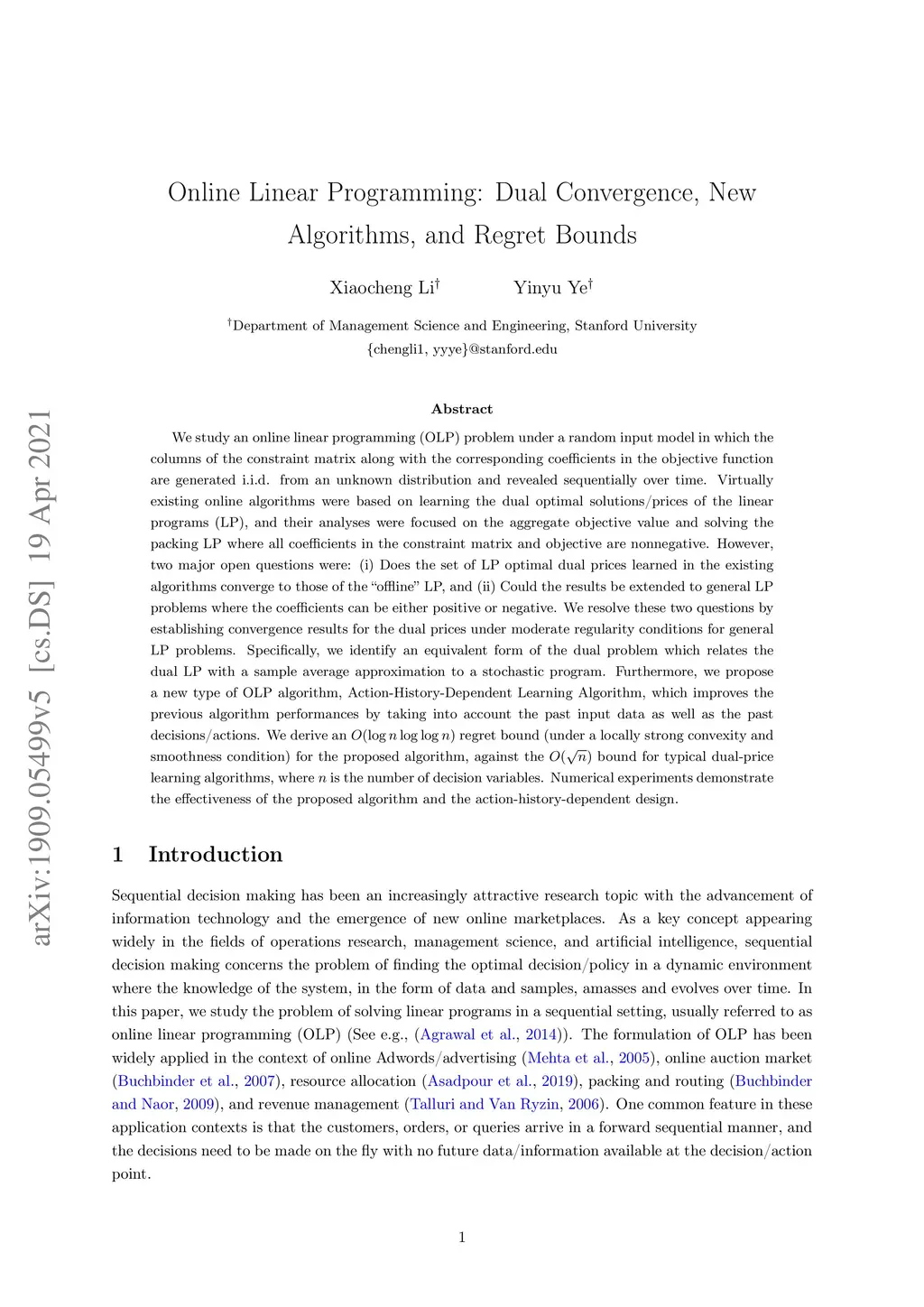 Online Linear Programming: Dual Convergence, New Algorithms, and Regret Bounds
