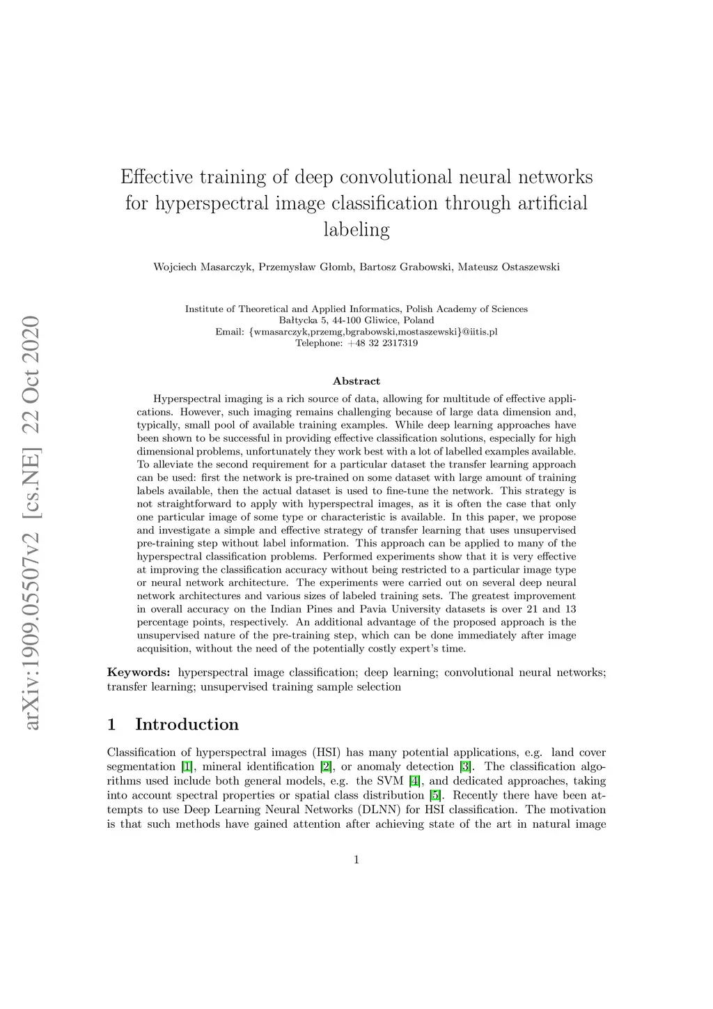 Hyperspectral imaging is a rich source of data, allowing for multitude of effective applications. However, such imaging remains challenging because of large data dimension and, typically, small pool of available training examples. While deep learning approaches have been shown to be successful in providing effective classification solutions, especially for high dimensional problems, unfortunately they work best with a lot of labelled examples available. To alleviate the second requirement for a particular dataset the transfer learning approach can be used: first the network is pre-trained on some dataset with large amount of training labels available, then the actual dataset is used to fine-tune the network. This strategy is not straightforward to apply with hyperspectral images, as it is often the case that only one particular image of some type or characteristic is available. In this paper, we propose and investigate a simple and effective strategy of transfer learning that uses unsupervised pre-training step without label information. This approach can be applied to many of the hyperspectral classification problems. Performed experiments show that it is very effective at improving the classification accuracy without being restricted to a particular image type or neural network architecture. The experiments were carried out on several deep neural network architectures and various sizes of labeled training sets. The greatest improvement in overall accuracy on the Indian Pines and Pavia University datasets is over 21 and 13 percentage points, respectively. An additional advantage of the proposed approach is the unsupervised nature of the pre-training step, which can be done immediately after image acquisition, without the need of the potentially costly expert's time.