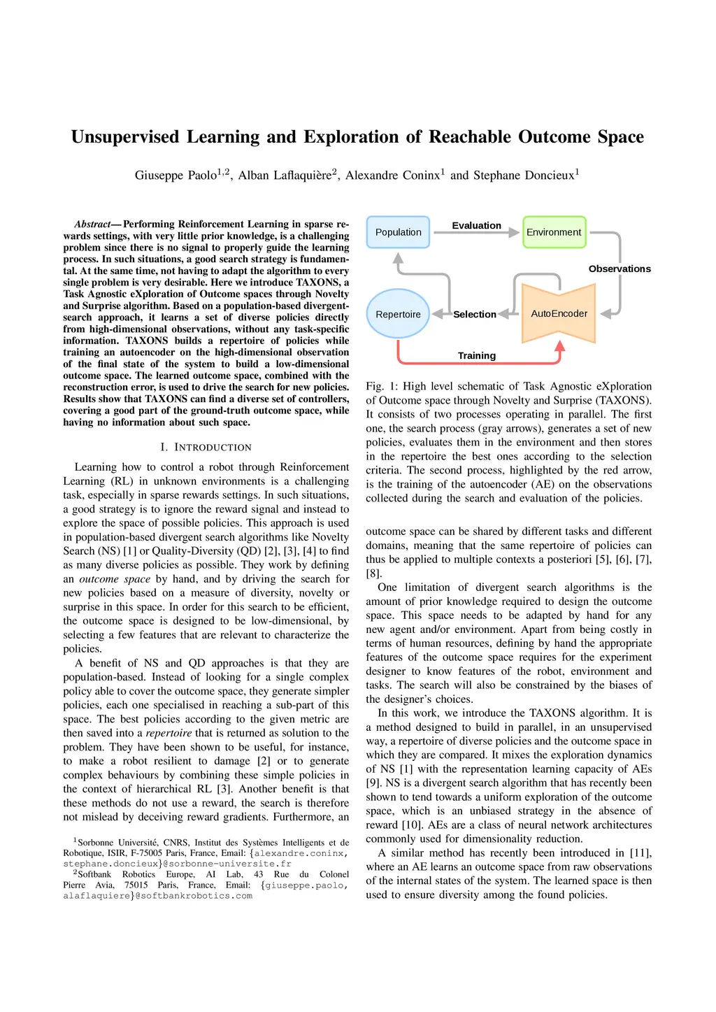 Performing Reinforcement Learning in sparse rewards settings, with very little prior knowledge, is a challenging problem since there is no signal to properly guide the learning process. In such situations, a good search strategy is fundamental. At the same time, not having to adapt the algorithm to every single problem is very desirable. Here we introduce TAXONS, a Task Agnostic eXploration of Outcome spaces through Novelty and Surprise algorithm. Based on a population-based divergent-search approach, it learns a set of diverse policies directly from high-dimensional observations, without any task-specific information. TAXONS builds a repertoire of policies while training an autoencoder on the high-dimensional observation of the final state of the system to build a low-dimensional outcome space. The learned outcome space, combined with the reconstruction error, is used to drive the search for new policies. Results show that TAXONS can find a diverse set of controllers, covering a good part of the ground-truth outcome space, while having no information about such space.