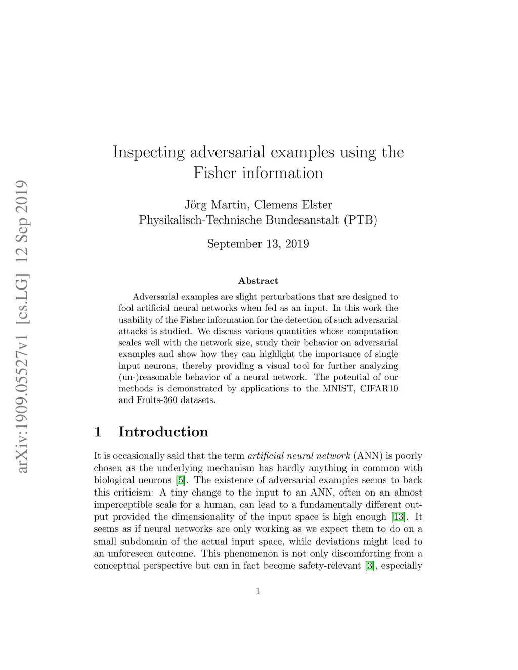 Adversarial examples are slight perturbations that are designed to fool artificial neural networks when fed as an input. In this work the usability of the Fisher information for the detection of such adversarial attacks is studied. We discuss various quantities whose computation scales well with the network size, study their behavior on adversarial examples and show how they can highlight the importance of single input neurons, thereby providing a visual tool for further analyzing (un-)reasonable behavior of a neural network. The potential of our methods is demonstrated by applications to the MNIST, CIFAR10 and Fruits-360 datasets.