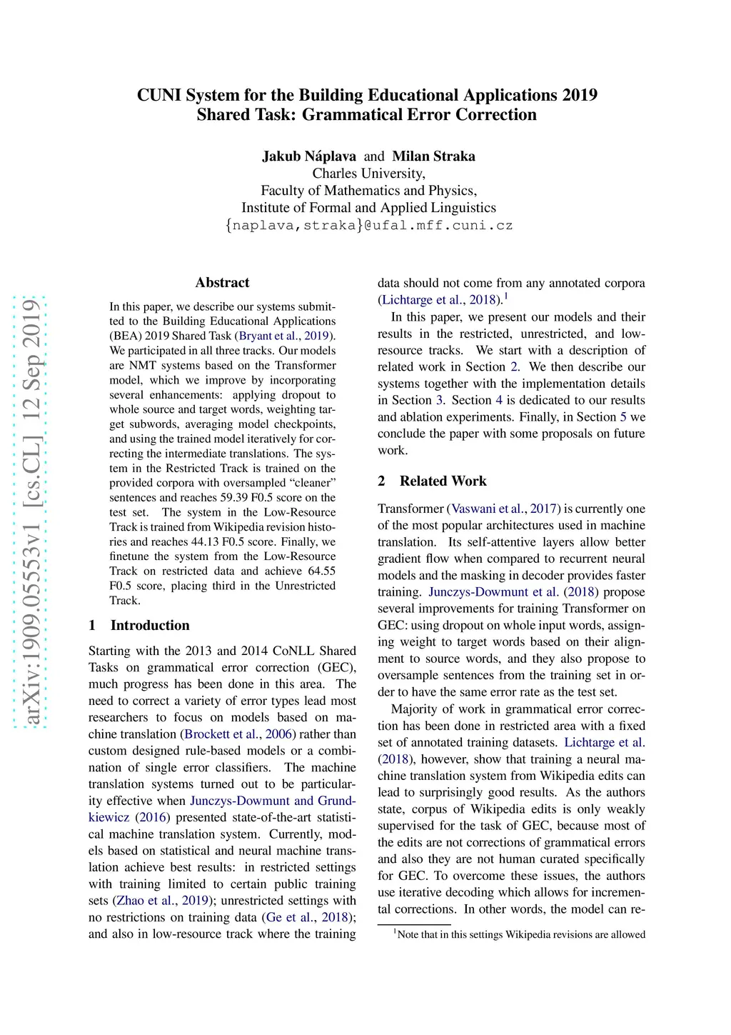 CUNI System for the Building Educational Applications 2019 Shared Task: