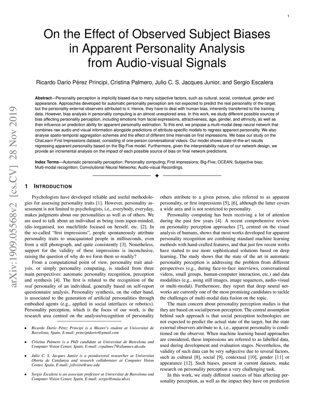 Personality perception is implicitly biased due to many subjective factors, such as cultural, social, contextual, gender and appearance. Approaches developed for automatic personality perception are not expected to predict the real personality of the target, but the personality external observers attributed to it. Hence, they have to deal with human bias, inherently transferred to the training data. However, bias analysis in personality computing is an almost unexplored area. In this work, we study different possible sources of bias affecting personality perception, including emotions from facial expressions, attractiveness, age, gender, and ethnicity, as well as their influence on prediction ability for apparent personality estimation. To this end, we propose a multi-modal deep neural network that combines raw audio and visual information alongside predictions of attribute-specific models to regress apparent personality. We also analyse spatio-temporal aggregation schemes and the effect of different time intervals on first impressions. We base our study on the ChaLearn First Impressions dataset, consisting of one-person conversational videos. Our model shows state-of-the-art results regressing apparent personality based on the Big-Five model. Furthermore, given the interpretability nature of our network design, we provide an incremental analysis on the impact of each possible source of bias on final network predictions.