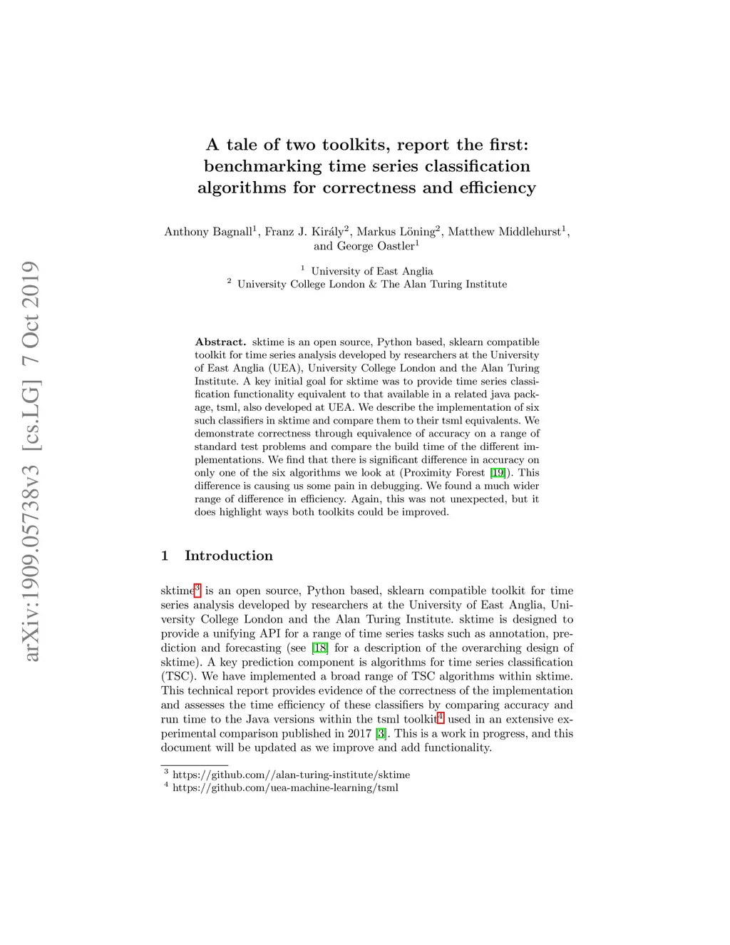sktime is an open source, Python based, sklearn compatible toolkit for time series analysis developed by researchers at the University of East Anglia (UEA), University College London and the Alan Turing Institute. A key initial goal for sktime was to provide time series classification functionality equivalent to that available in a related java package, tsml, also developed at UEA. We describe the implementation of six such classifiers in sktime and compare them to their tsml equivalents. We demonstrate correctness through equivalence of accuracy on a range of standard test problems and compare the build time of the different implementations. We find that there is significant difference in accuracy on only one of the six algorithms we look at (Proximity Forest). This difference is causing us some pain in debugging. We found a much wider range of difference in efficiency. Again, this was not unexpected, but it does highlight ways both toolkits could be improved.
