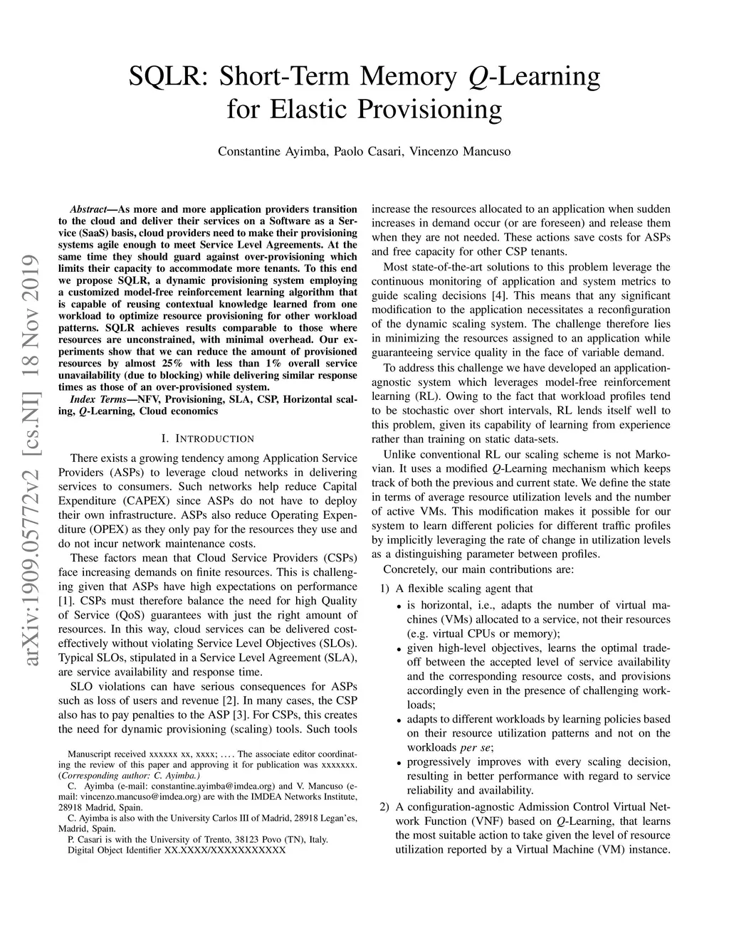SQLR: Short-Term Memory Q-Learning for Elastic Provisioning