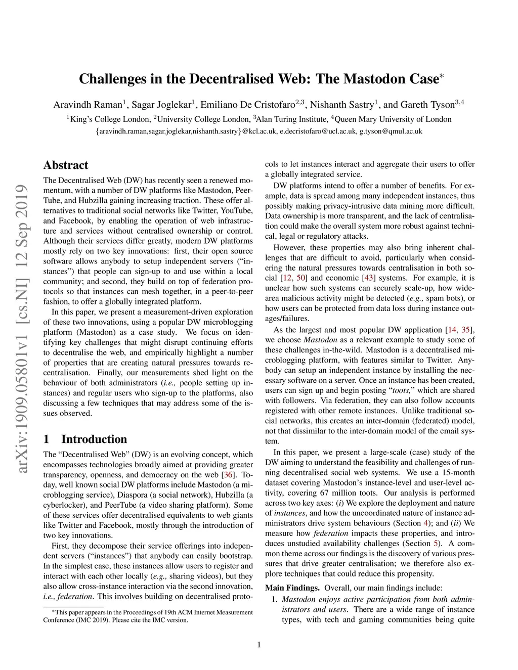The Decentralised Web (DW) has recently seen a renewed momentum, with a number of DW platforms like Mastodon, Peer-Tube, and Hubzilla gaining increasing traction. These offer alternatives to traditional social networks like Twitter, YouTube, and Facebook, by enabling the operation of web infrastructure and services without centralised ownership or control. Although their services differ greatly, modern DW platforms mostly rely on two key innovations: first, their open source software allows anybody to setup independent servers ("instances") that people can sign-up to and use within a local community; and second, they build on top of federation protocols so that instances can mesh together, in a peer-to-peer fashion, to offer a globally integrated platform. In this paper, we present a measurement-driven exploration of these two innovations, using a popular DW microblogging platform (Mastodon) as a case study. We focus on identifying key challenges that might disrupt continuing efforts to decentralise the web, and empirically highlight a number of properties that are creating natural pressures towards recentralisation. Finally, our measurements shed light on the behaviour of both administrators (i.e., people setting up instances) and regular users who sign-up to the platforms, also discussing a few techniques that may address some of the issues observed.