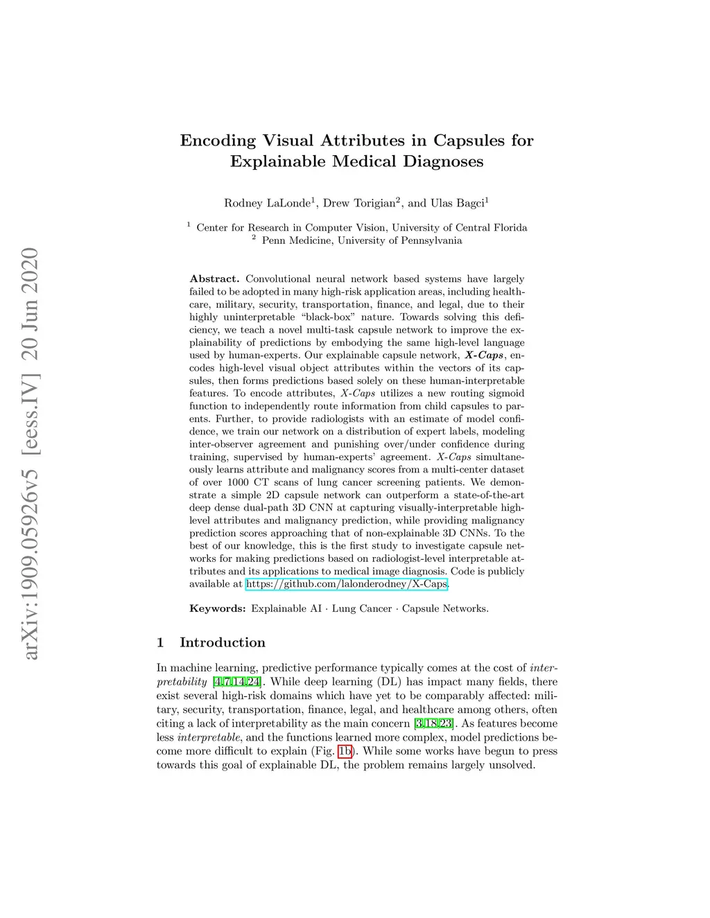 Convolutional neural network based systems have largely failed to be adopted in many high-risk application areas, including healthcare, military, security, transportation, finance, and legal, due to their highly uninterpretable "black-box" nature. Towards solving this deficiency, we teach a novel multi-task capsule network to improve the explainability of predictions by embodying the same high-level language used by human-experts. Our explainable capsule network, X-Caps, encodes high-level visual object attributes within the vectors of its capsules, then forms predictions based solely on these human-interpretable features. To encode attributes, X-Caps utilizes a new routing sigmoid function to independently route information from child capsules to parents. Further, to provide radiologists with an estimate of model confidence, we train our network on a distribution of expert labels, modeling inter-observer agreement and punishing over/under confidence during training, supervised by human-experts' agreement. X-Caps simultaneously learns attribute and malignancy scores from a multi-center dataset of over 1000 CT scans of lung cancer screening patients. We demonstrate a simple 2D capsule network can outperform a state-of-the-art deep dense dual-path 3D CNN at capturing visually-interpretable high-level attributes and malignancy prediction, while providing malignancy prediction scores approaching that of non-explainable 3D CNNs. To the best of our knowledge, this is the first study to investigate capsule networks for making predictions based on radiologist-level interpretable attributes and its applications to medical image diagnosis. Code is publicly available at https://github.com/lalonderodney/X-Caps .