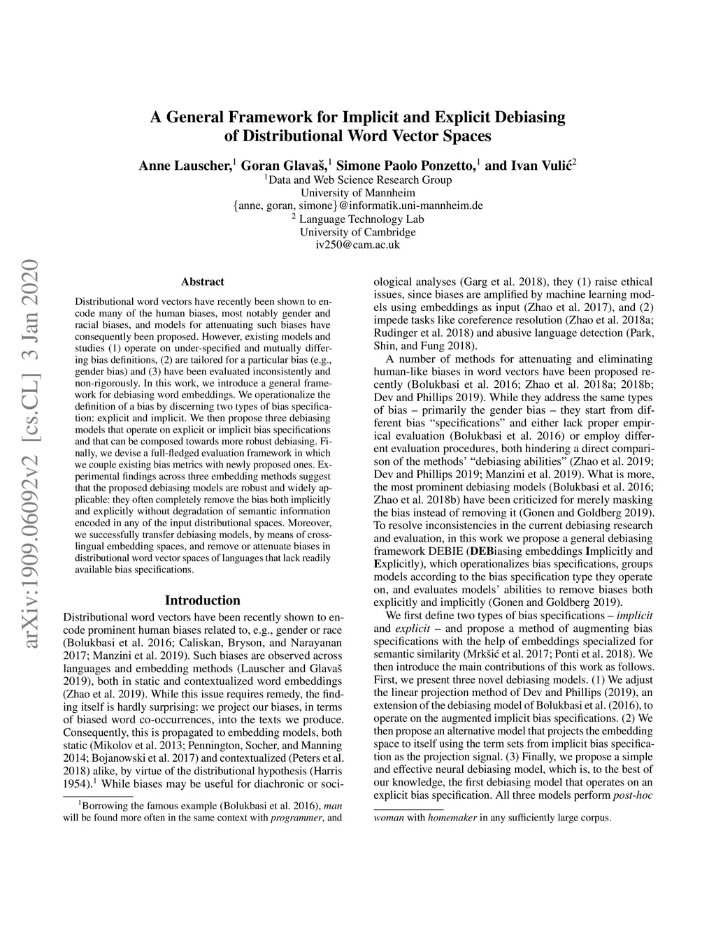 Distributional word vectors have recently been shown to encode many of the human biases, most notably gender and racial biases, and models for attenuating such biases have consequently been proposed. However, existing models and studies (1) operate on under-specified and mutually differing bias definitions, (2) are tailored for a particular bias (e.g., gender bias) and (3) have been evaluated inconsistently and non-rigorously. In this work, we introduce a general framework for debiasing word embeddings. We operationalize the definition of a bias by discerning two types of bias specification: explicit and implicit. We then propose three debiasing models that operate on explicit or implicit bias specifications and that can be composed towards more robust debiasing. Finally, we devise a full-fledged evaluation framework in which we couple existing bias metrics with newly proposed ones. Experimental findings across three embedding methods suggest that the proposed debiasing models are robust and widely applicable: they often completely remove the bias both implicitly and explicitly without degradation of semantic information encoded in any of the input distributional spaces. Moreover, we successfully transfer debiasing models, by means of cross-lingual embedding spaces, and remove or attenuate biases in distributional word vector spaces of languages that lack readily available bias specifications.