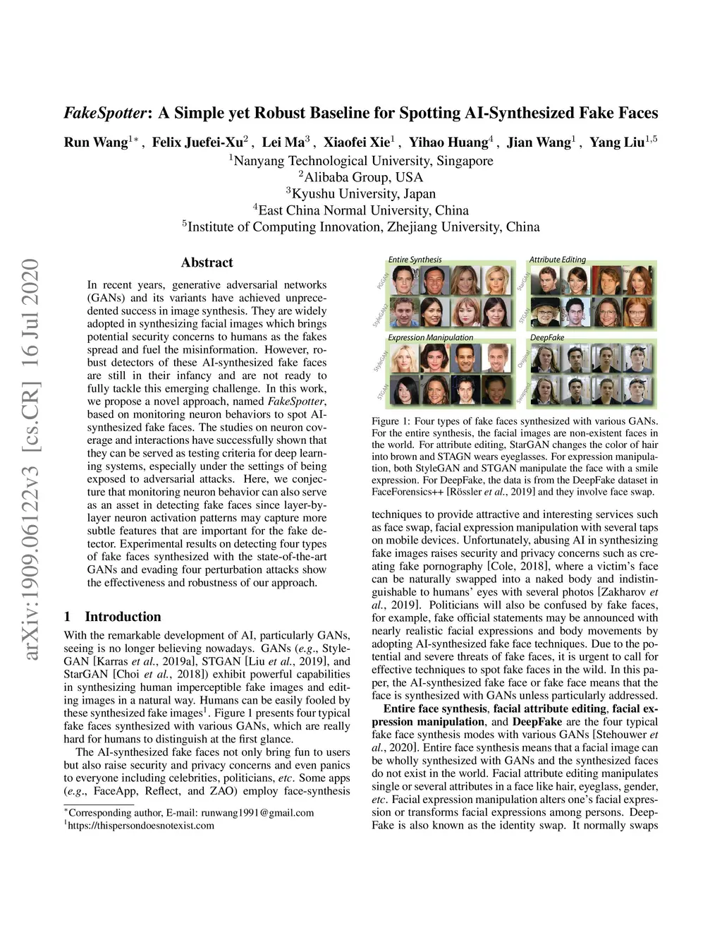 In recent years, generative adversarial networks (GANs) and its variants have achieved unprecedented success in image synthesis. They are widely adopted in synthesizing facial images which brings potential security concerns to humans as the fakes spread and fuel the misinformation. However, robust detectors of these AI-synthesized fake faces are still in their infancy and are not ready to fully tackle this emerging challenge. In this work, we propose a novel approach, named FakeSpotter, based on monitoring neuron behaviors to spot AI-synthesized fake faces. The studies on neuron coverage and interactions have successfully shown that they can be served as testing criteria for deep learning systems, especially under the settings of being exposed to adversarial attacks. Here, we conjecture that monitoring neuron behavior can also serve as an asset in detecting fake faces since layer-by-layer neuron activation patterns may capture more subtle features that are important for the fake detector. Experimental results on detecting four types of fake faces synthesized with the state-of-the-art GANs and evading four perturbation attacks show the effectiveness and robustness of our approach.