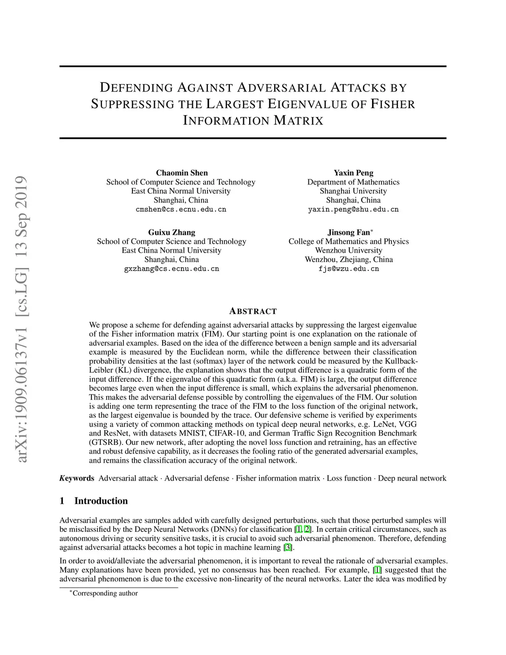 We propose a scheme for defending against adversarial attacks by suppressing the largest eigenvalue of the Fisher information matrix (FIM). Our starting point is one explanation on the rationale of adversarial examples. Based on the idea of the difference between a benign sample and its adversarial example is measured by the Euclidean norm, while the difference between their classification probability densities at the last (softmax) layer of the network could be measured by the Kullback-Leibler (KL) divergence, the explanation shows that the output difference is a quadratic form of the input difference. If the eigenvalue of this quadratic form (a.k.a. FIM) is large, the output difference becomes large even when the input difference is small, which explains the adversarial phenomenon. This makes the adversarial defense possible by controlling the eigenvalues of the FIM. Our solution is adding one term representing the trace of the FIM to the loss function of the original network, as the largest eigenvalue is bounded by the trace. Our defensive scheme is verified by experiments using a variety of common attacking methods on typical deep neural networks, e.g. LeNet, VGG and ResNet, with datasets MNIST, CIFAR-10, and German Traffic Sign Recognition Benchmark (GTSRB). Our new network, after adopting the novel loss function and retraining, has an effective and robust defensive capability, as it decreases the fooling ratio of the generated adversarial examples, and remains the classification accuracy of the original network.
