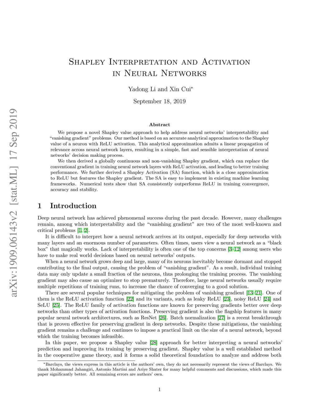 We propose a novel Shapley value approach to help address neural networks' interpretability and "vanishing gradient" problems. Our method is based on an accurate analytical approximation to the Shapley value of a neuron with ReLU activation. This analytical approximation admits a linear propagation of relevance across neural network layers, resulting in a simple, fast and sensible interpretation of neural networks' decision making process. We then derived a globally continuous and non-vanishing Shapley gradient, which can replace the conventional gradient in training neural network layers with ReLU activation, and leading to better training performance. We further derived a Shapley Activation (SA) function, which is a close approximation to ReLU but features the Shapley gradient. The SA is easy to implement in existing machine learning frameworks. Numerical tests show that SA consistently outperforms ReLU in training convergence, accuracy and stability.