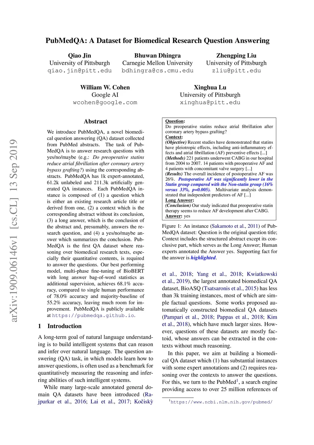 We introduce PubMedQA, a novel biomedical question answering (QA) dataset collected from PubMed abstracts. The task of PubMedQA is to answer research questions with yes/no/maybe (e.g.: Do preoperative statins reduce atrial fibrillation after coronary artery bypass grafting?) using the corresponding abstracts. PubMedQA has 1k expert-annotated, 61.2k unlabeled and 211.3k artificially generated QA instances. Each PubMedQA instance is composed of (1) a question which is either an existing research article title or derived from one, (2) a context which is the corresponding abstract without its conclusion, (3) a long answer, which is the conclusion of the abstract and, presumably, answers the research question, and (4) a yes/no/maybe answer which summarizes the conclusion. PubMedQA is the first QA dataset where reasoning over biomedical research texts, especially their quantitative contents, is required to answer the questions. Our best performing model, multi-phase fine-tuning of BioBERT with long answer bag-of-word statistics as additional supervision, achieves 68.1% accuracy, compared to single human performance of 78.0% accuracy and majority-baseline of 55.2% accuracy, leaving much room for improvement. PubMedQA is publicly available at https://pubmedqa.github.io.