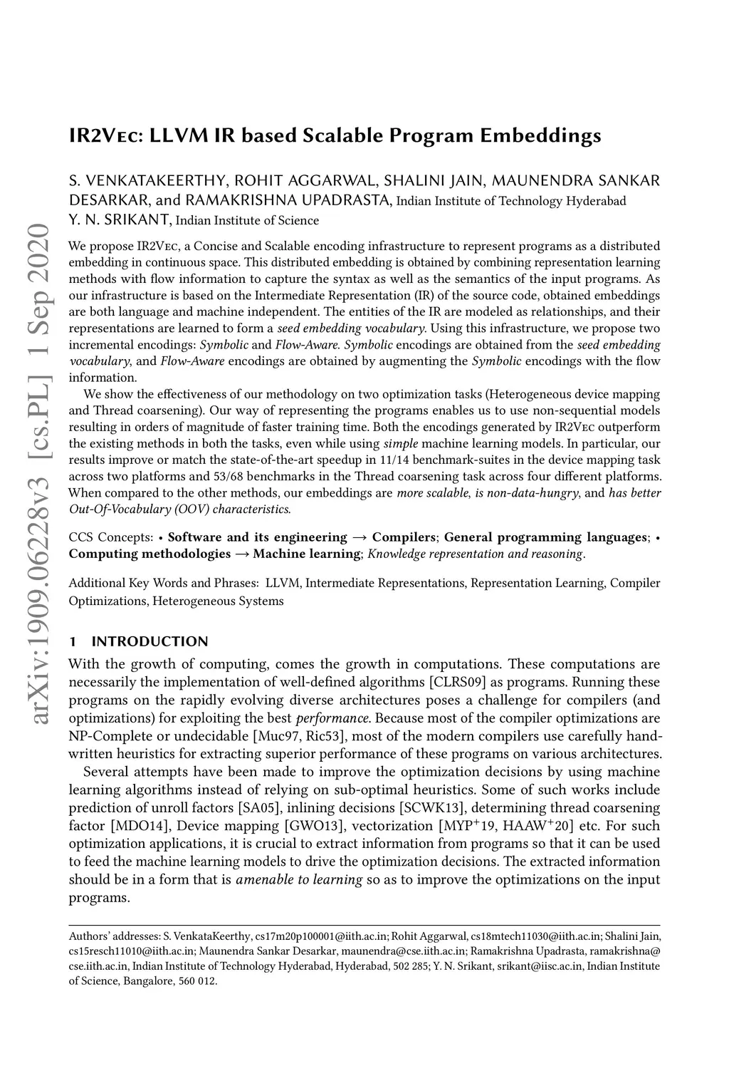 IR2Vec: LLVM IR based Scalable Program Embeddings