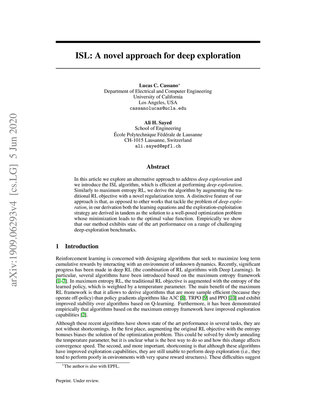 In this article we explore an alternative approach to address deep exploration and we introduce the ISL algorithm, which is efficient at performing deep exploration. Similarly to maximum entropy RL, we derive the algorithm by augmenting the traditional RL objective with a novel regularization term. A distinctive feature of our approach is that, as opposed to other works that tackle the problem of deep exploration, in our derivation both the learning equations and the exploration-exploitation strategy are derived in tandem as the solution to a well-posed optimization problem whose minimization leads to the optimal value function. Empirically we show that our method exhibits state of the art performance on a range of challenging deep-exploration benchmarks.