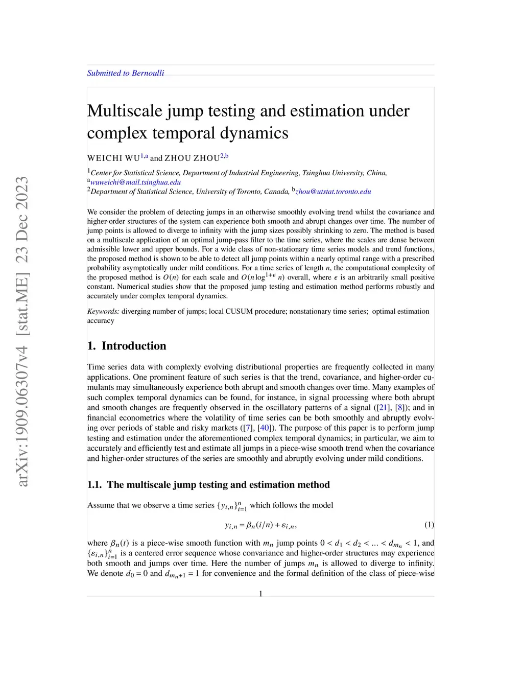 We consider the problem of detecting jumps in an otherwise smoothly evolving trend whilst the covariance and higher-order structures of the system can experience both smooth and abrupt changes over time. The number of jump points is allowed to diverge to infinity with the jump sizes possibly shrinking to zero. The method is based on a multiscale application of an optimal jump-pass filter to the time series, where the scales are dense between admissible lower and upper bounds. For a wide class of non-stationary time series models and trend functions, the proposed method is shown to be able to detect all jump points within a nearly optimal range with a prescribed probability asymptotically under mild conditions. For a time series of length , the computational complexity of the proposed method is for each scale and overall, where is an arbitrarily small positive constant. Numerical studies show that the proposed jump testing and estimation method performs robustly and accurately under complex temporal dynamics.