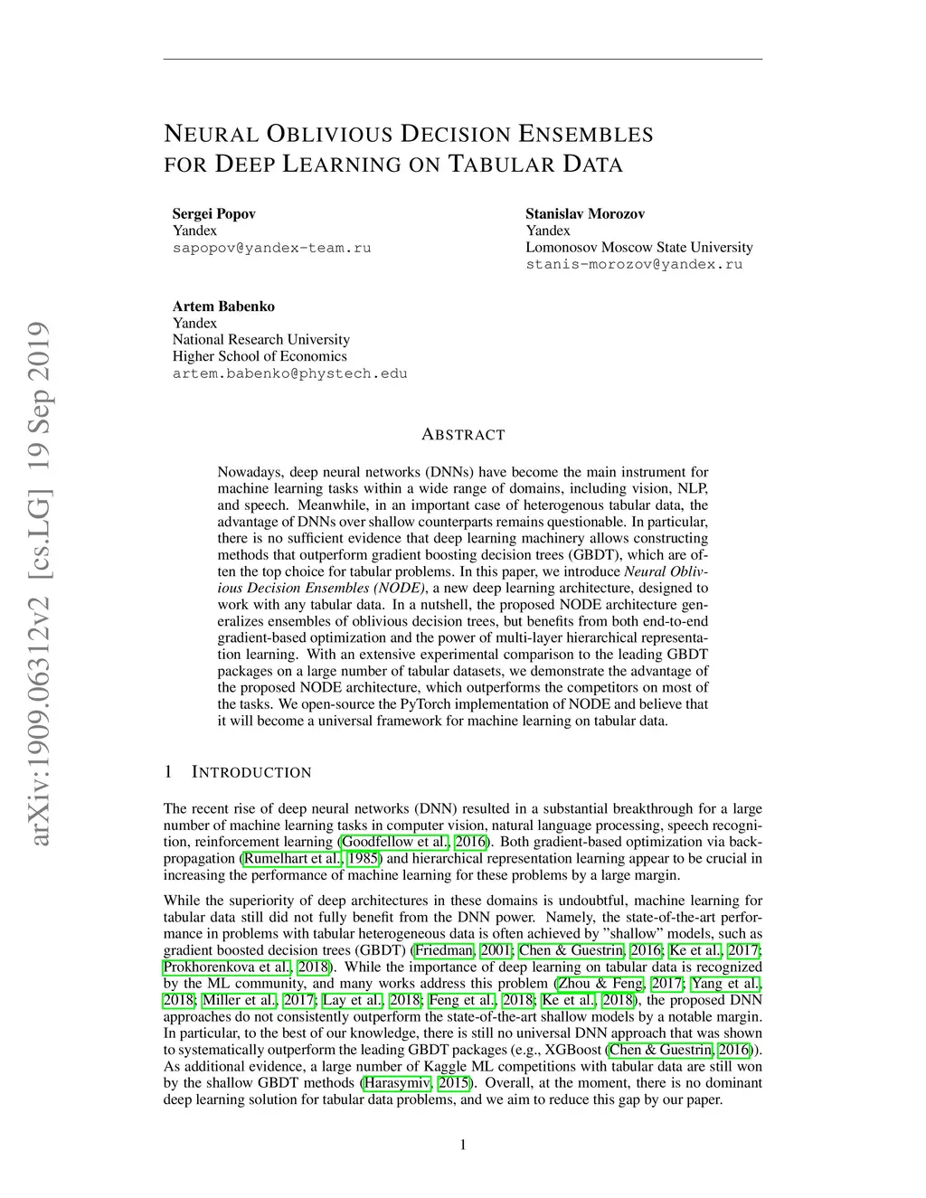 Nowadays, deep neural networks (DNNs) have become the main instrument for machine learning tasks within a wide range of domains, including vision, NLP, and speech. Meanwhile, in an important case of heterogenous tabular data, the advantage of DNNs over shallow counterparts remains questionable. In particular, there is no sufficient evidence that deep learning machinery allows constructing methods that outperform gradient boosting decision trees (GBDT), which are often the top choice for tabular problems. In this paper, we introduce Neural Oblivious Decision Ensembles (NODE), a new deep learning architecture, designed to work with any tabular data. In a nutshell, the proposed NODE architecture generalizes ensembles of oblivious decision trees, but benefits from both end-to-end gradient-based optimization and the power of multi-layer hierarchical representation learning. With an extensive experimental comparison to the leading GBDT packages on a large number of tabular datasets, we demonstrate the advantage of the proposed NODE architecture, which outperforms the competitors on most of the tasks. We open-source the PyTorch implementation of NODE and believe that it will become a universal framework for machine learning on tabular data.