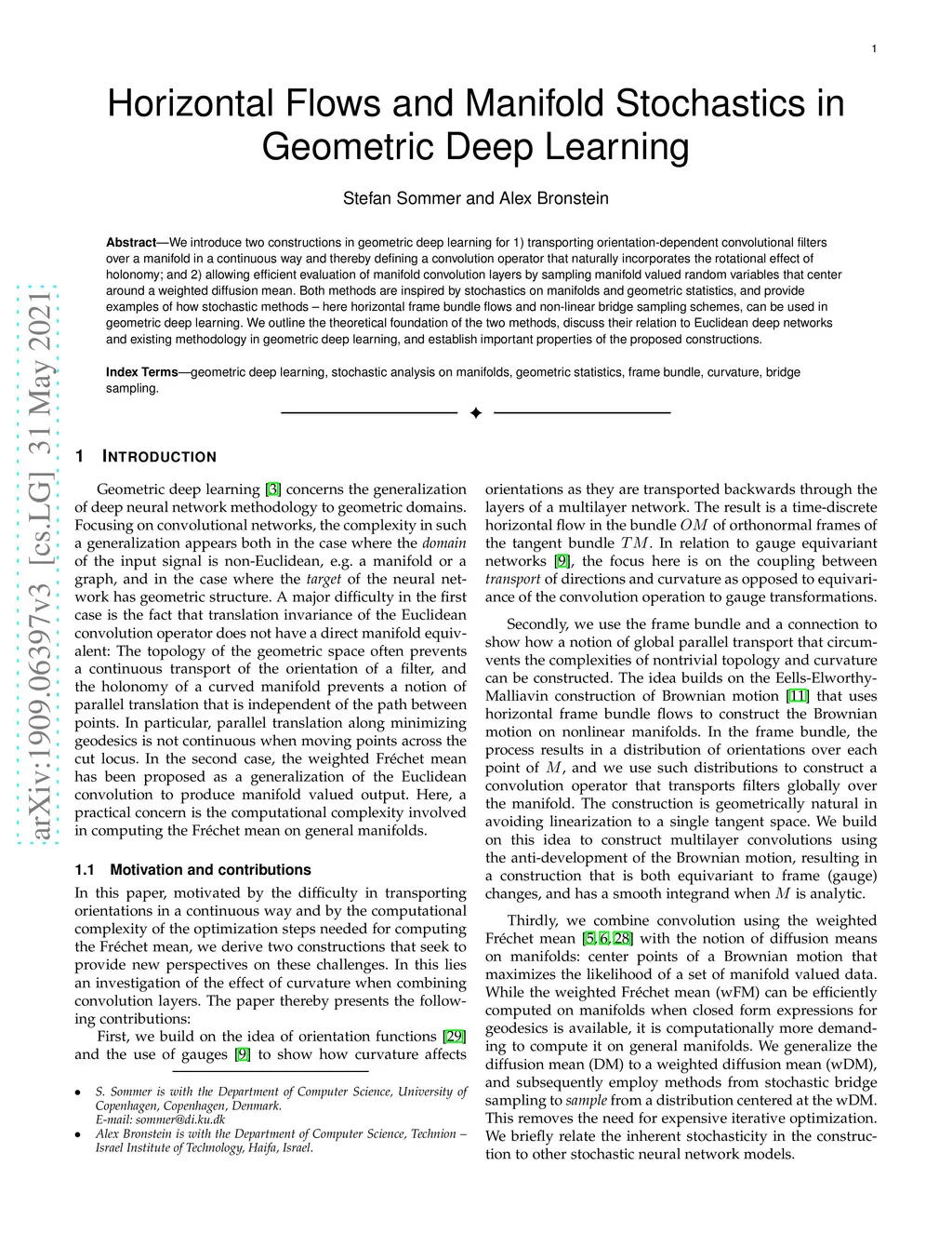 We introduce two constructions in geometric deep learning for 1) transporting orientation-dependent convolutional filters over a manifold in a continuous way and thereby defining a convolution operator that naturally incorporates the rotational effect of holonomy; and 2) allowing efficient evaluation of manifold convolution layers by sampling manifold valued random variables that center around a weighted diffusion mean. Both methods are inspired by stochastics on manifolds and geometric statistics, and provide examples of how stochastic methods -- here horizontal frame bundle flows and non-linear bridge sampling schemes, can be used in geometric deep learning. We outline the theoretical foundation of the two methods, discuss their relation to Euclidean deep networks and existing methodology in geometric deep learning, and establish important properties of the proposed constructions.
