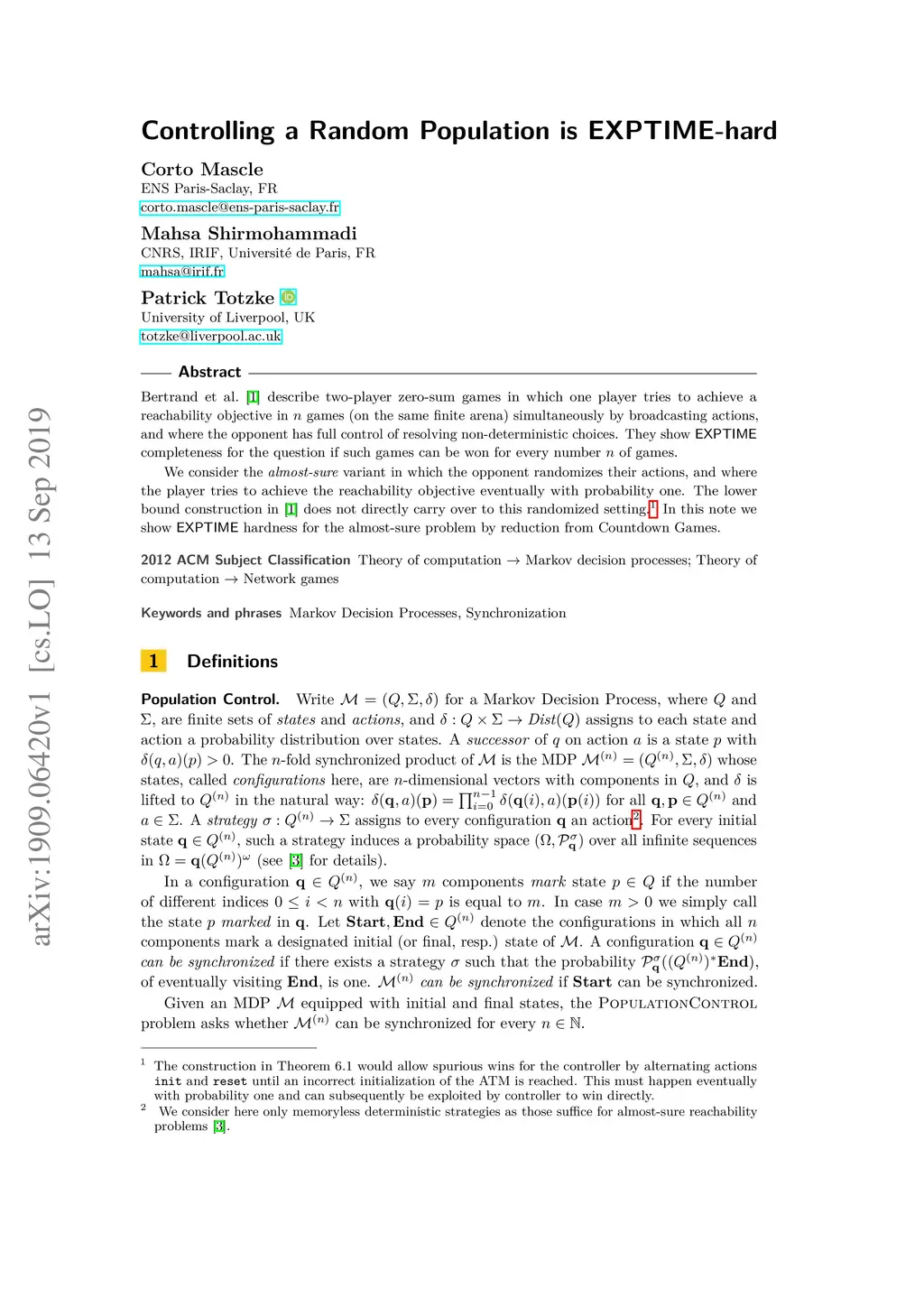 Controlling a Random Population is EXPTIME-hard