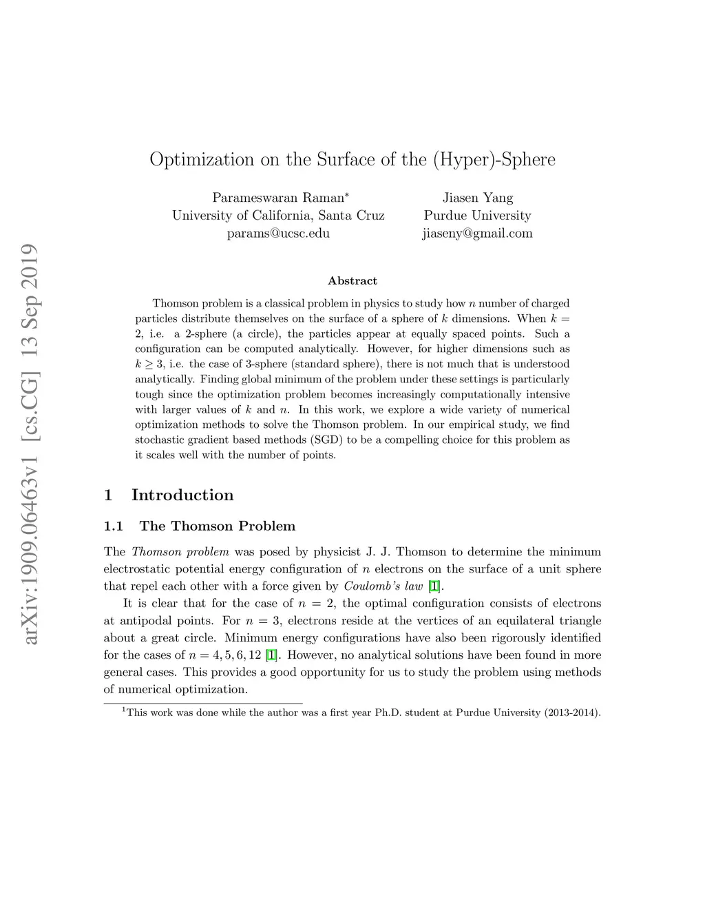 Thomson problem is a classical problem in physics to study how number of charged particles distribute themselves on the surface of a sphere of dimensions. When , i.e. a 2-sphere (a circle), the particles appear at equally spaced points. Such a configuration can be computed analytically. However, for higher dimensions such as , i.e. the case of 3-sphere (standard sphere), there is not much that is understood analytically. Finding global minimum of the problem under these settings is particularly tough since the optimization problem becomes increasingly computationally intensive with larger values of and . In this work, we explore a wide variety of numerical optimization methods to solve the Thomson problem. In our empirical study, we find stochastic gradient based methods (SGD) to be a compelling choice for this problem as it scales well with the number of points.