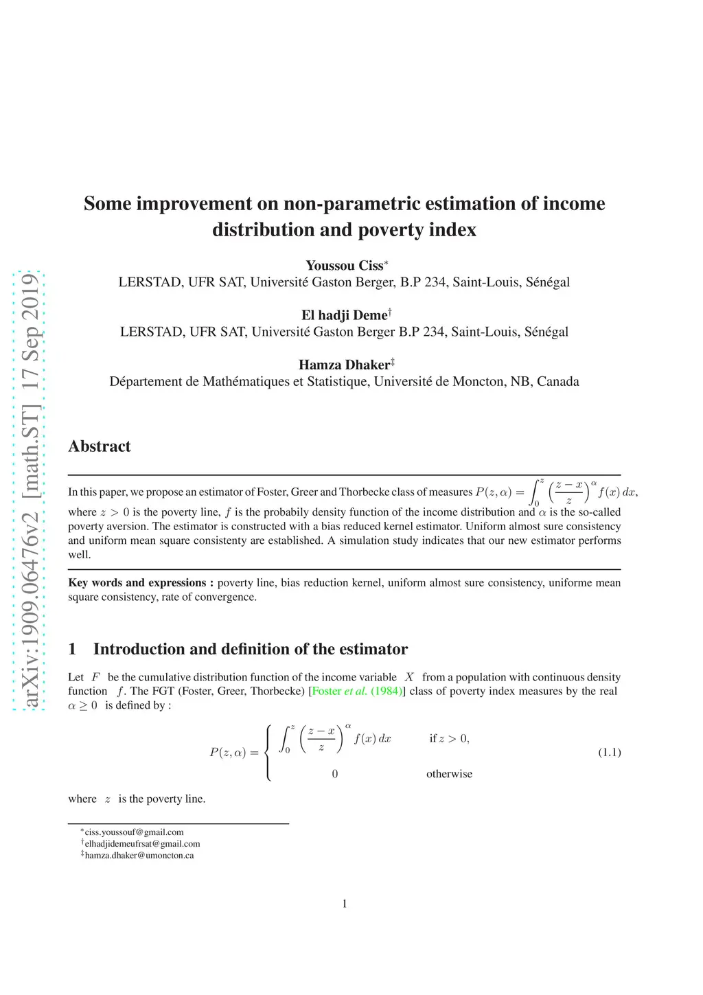 In this paper, we propose an estimator of Foster, Greer and Thorbecke class of measures , where is the poverty line, is the probabily density function of the income distribution and is the so-called poverty aversion. The estimator is constructed with a bias reduced kernel estimator. Uniform almost sure consistency and uniform mean square consistenty are established. A simulation study indicates that our new estimator performs well.