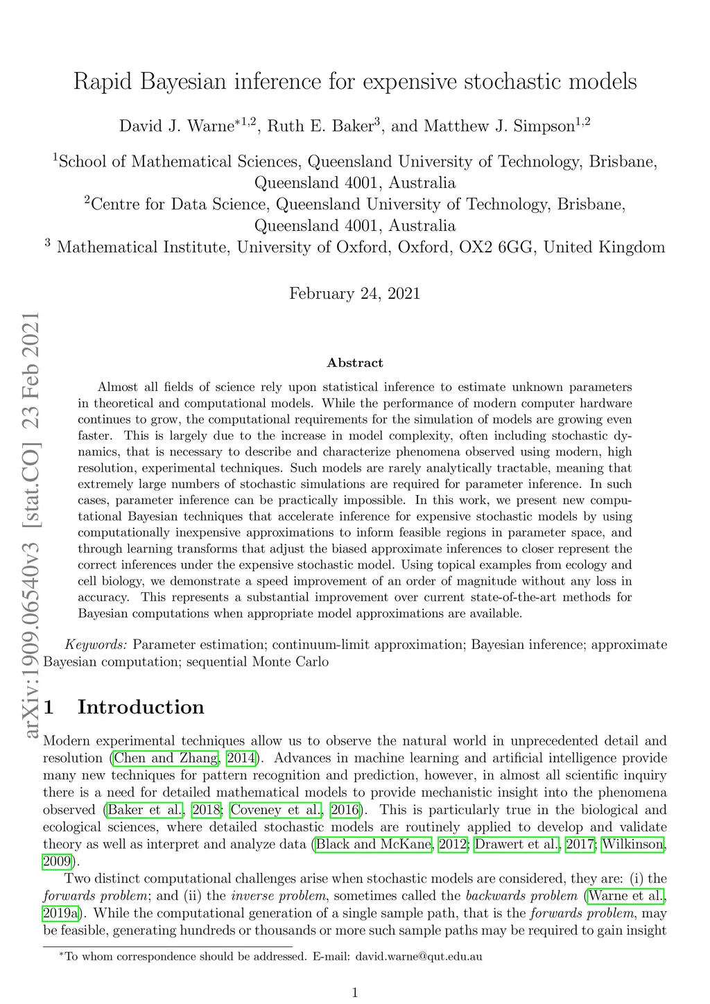 Almost all fields of science rely upon statistical inference to estimate unknown parameters in theoretical and computational models. While the performance of modern computer hardware continues to grow, the computational requirements for the simulation of models are growing even faster. This is largely due to the increase in model complexity, often including stochastic dynamics, that is necessary to describe and characterize phenomena observed using modern, high resolution, experimental techniques. Such models are rarely analytically tractable, meaning that extremely large numbers of stochastic simulations are required for parameter inference. In such cases, parameter inference can be practically impossible. In this work, we present new computational Bayesian techniques that accelerate inference for expensive stochastic models by using computationally inexpensive approximations to inform feasible regions in parameter space, and through learning transforms that adjust the biased approximate inferences to closer represent the correct inferences under the expensive stochastic model. Using topical examples from ecology and cell biology, we demonstrate a speed improvement of an order of magnitude without any loss in accuracy. This represents a substantial improvement over current state-of-the-art methods for Bayesian computations when appropriate model approximations are available.